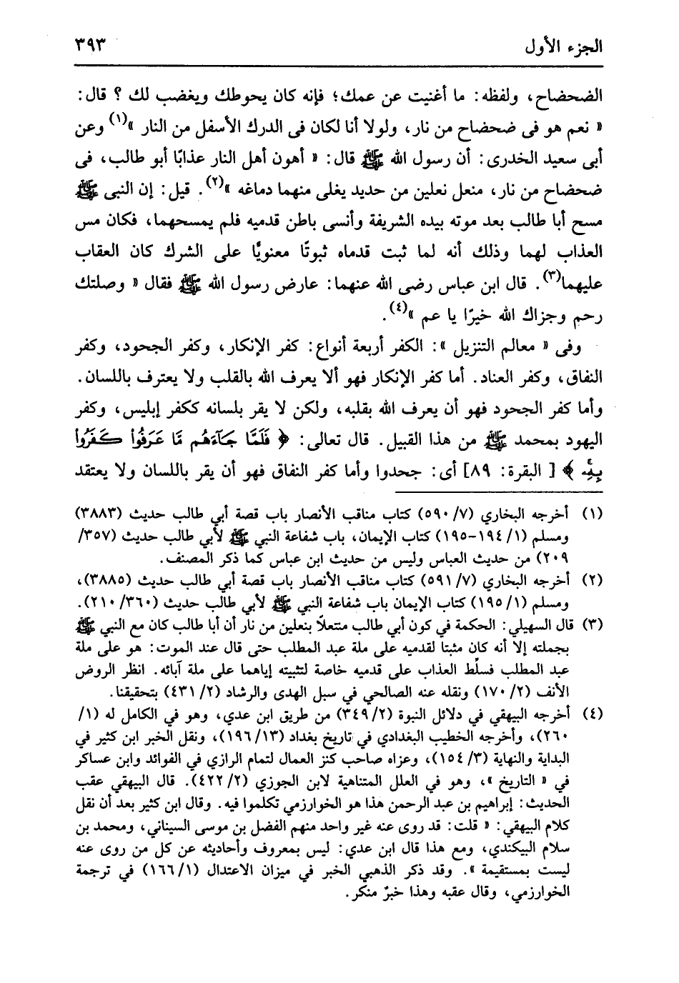 الضحضاح وَلَفظه مَا أغنيت عَن عمك فَإِنَّهُ كَانَ يحوطك ويغضب لَك قَالَ نعم هُوَ فِي ضحضاح من نَار وَلَوْلَا أَنا لَكَانَ فِي الدَّرك الْأَسْفَل من النَّار وَعَن أبي سعيد الْخُدْرِيّ أَن رَسُول الله