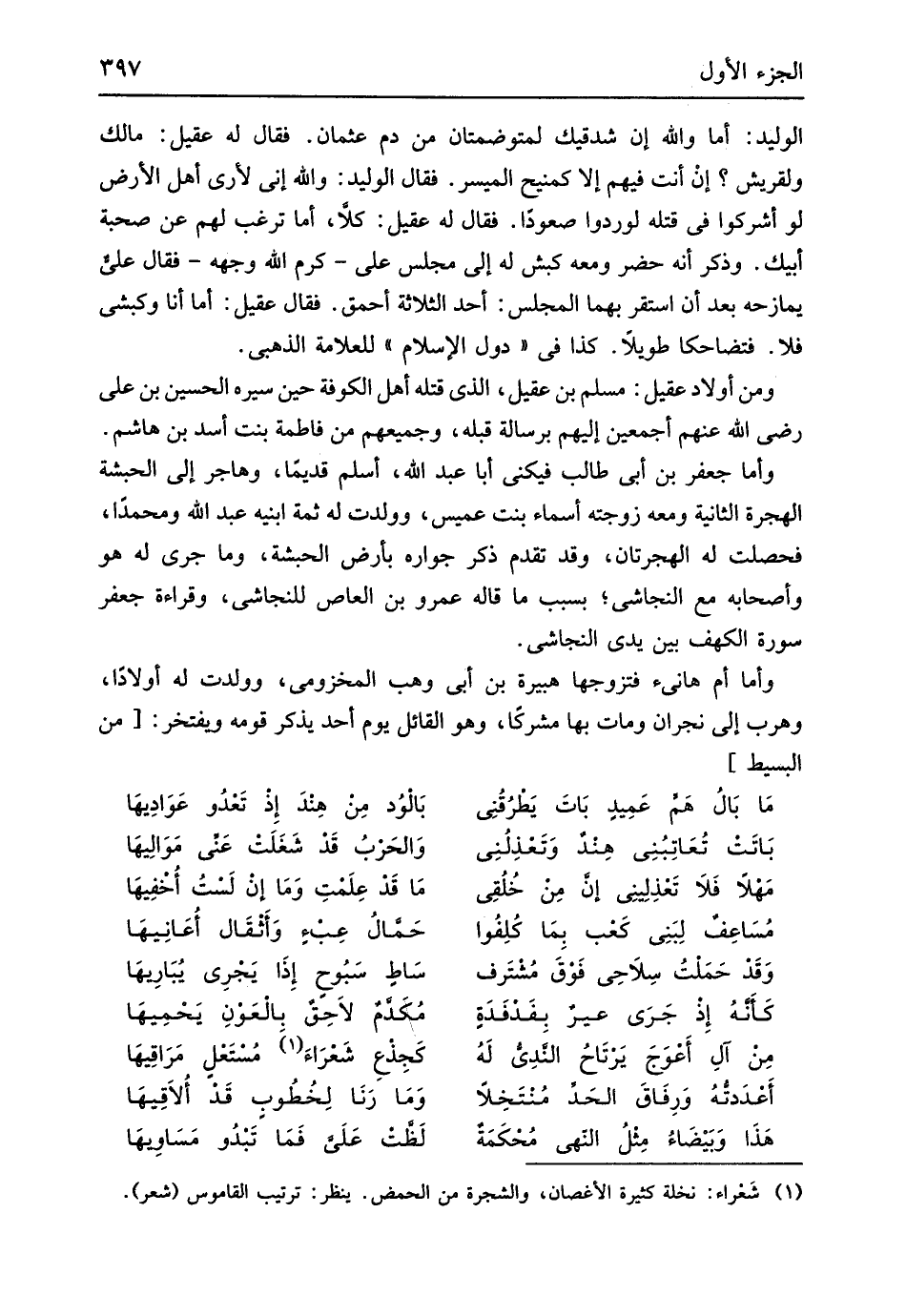 الْوَلِيد أما وَالله إِن شدقيك لمتوضمتان من دم عُثْمَان فَقَالَ لَهُ عقيل ملك ولقريش إِن أَنْت فيهم لَا كمنيح الميسر فَقَالَ الْوَلِيد وَالله إِنِّي لأرى أهل الأَرْض لَو أشركوا فِي قَتله لوردوا صعُودًا فَقَالَ لَهُ عقيل كلا أما ترغب لَهُم عَن صُحْبَة أَبِيك وَذكر أَنه حضر وَمَعَهُ كَبْش لَهُ إِلَى مجْلِس عَليّ كرم الله وَجهه فَقَالَ عَليّ يمازحه بعد أَن اسْتَقر بهما الْمجْلس أحد الثَّلَاثَة أَحمَق فَقَالَ عقيل أما أَنا وكبشي فَلَا فتضاحكا طَويلا كَذَا فِي دوَل الْإِسْلَام للعلامة الذَّهَبِيّ وَمن أَوْلَاد عقيل مُسلم بن عقيل الَّذِي قَتله أهل الْكُوفَة حِين سيره الْحسن بن عَليّ رَضِي الله عَنْهُم أَجْمَعِينَ إِلَيْهِم برسالة قبله وجميعهم من فاطمبة بنت أَسد بن هَاشم وَأما جَعْفَر بن أبي طَالب فيكنى أَبَا عبد الله أسلم قَدِيما وَهَاجَر إِلَى الْحَبَشَة الْهِجْرَة الثَّانِيَة وَمَعَهُ زَوجته أَسمَاء بنت عُمَيْس وَولدت لَهُ ثمَّة ابنيه عبد الله ومحمداً فحصلت لَهُ الهجرتان وَقد تقدم ذكر جواره بِأَرْض الْحَبَشَة وَمَا جرى لَهُ هُوَ وَأَصْحَابه مَعَ النَّجَاشِيّ بِسَبَب مَا قَالَه عَمْرو بن الْعَاصِ للنجاشي وَقِرَاءَة جَعْفَر سُورَة الْكَهْف بَين يَدي النَّجَاشِيّ وَأما أم هانىء فَتَزَوجهَا هُبَيْرَة بن أبي وهب المَخْزُومِي وَولدت لَهُ أَوْلَادًا وهرب إِلَى نَجْرَان وَمَات بهَا مُشْركًا وَهُوَ الْقَائِل يَوْم أحد يذكر قومه ويفتخر // (من الْبَسِيط) //