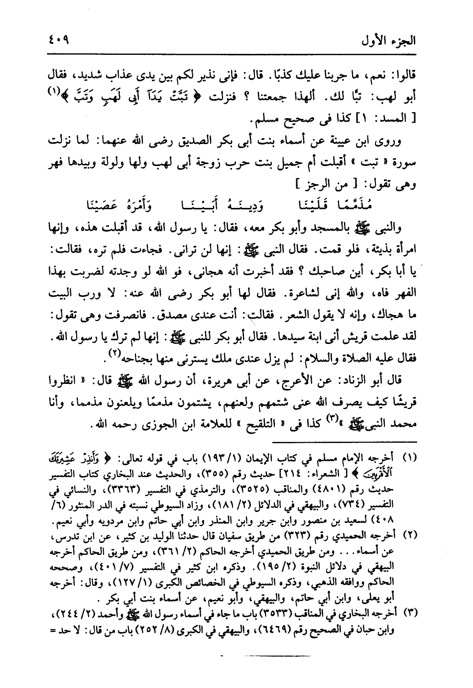 قَالُوا نعم مَا جربنَا عَلَيْك كذبا قَالَ فَإِنِّي نَذِير لكم بَين يَدي عَذَاب شَدِيد فَقَالَ أَبُو لَهب تَبًّا لَك أَلِهَذَا جمعتنَا فَنزلت {تَبَّتْ يَدَا أَبِي لَهَبٍ وَتَبَّ} المسد 1 كَذَا فِي صَحِيح مُسلم وروى ابْن عُيَيْنَة عَن أَسمَاء بنت أبي بكر الصّديق رَضِي الله عَنْهُمَا لما نزلت سُورَة تبت أَقبلت أم جميل بنت حَرْب زَوْجَة أبي لَهب وَلها ولولة وبيدها فهر وَهِي تَقول // (من الرجز) //