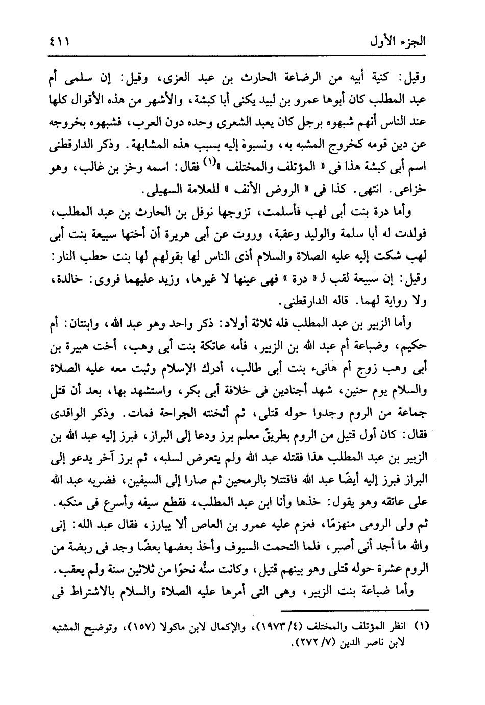 وَقيل كنية أَبِيه من الرضَاعَة الْحَارِث بن عبد الْعُزَّى وَقيل إِن سلمى أم عبد الْمطلب كَانَ أَبوهَا عَمْرو بن لبيد يكنى أَبَا كَبْشَة وَالْأَشْهر من هَذِه الْأَقْوَال كلهَا عِنْد النَّاس أَنهم شبهوه بِرَجُل كَانَ يعبد الشعري وَحده دون الْعَرَب فشبهوه بِخُرُوجِهِ عَن دين قومه كخروج الْمُشبه بِهِ ونسبوه إِلَيْهِ بِسَبَب هَذِه المشابهة وَذكر الدَّارَقُطْنِيّ اسْم أبي كَبْشَة هَذَا فِي المؤتلف والمختلف فَقَالَ اسْمه وخز بن غَالب وَهُوَ خزاعي انْتهى كَذَا فِي الرَّوْض الْأنف للعلامة السُّهيْلي وَأما درة بنت أبي لَهب فَأسْلمت تزَوجهَا نَوْفَل بن الْحَارِث بن عبد الْمطلب فَولدت لَهُ أَبَا سَلمَة والوليد وَعقبَة وروت عَن أبي هُرَيْرَة أَن أُخْتهَا سبيعة بنت أبي لَهب شكت إِلَيْهِ عَلَيْهِ الصَّلَاة وَالسَّلَام أَذَى النَّاس لَهَا بقَوْلهمْ لَهَا بنت حطب النَّار وَقيل إِن سبيعة لقب لدرة فَهِيَ عينهَا لَا غَيرهَا وَزيد عَلَيْهِمَا فروى خالدة وَلَا رِوَايَة لَهما قَالَه الدَّارَقُطْنِيّ وَأما الزبير بن عبد الْمطلب فَلهُ ثَلَاثَة أَوْلَاد ذكر وَاحِد وَهُوَ عبد الله وابنتان أم حَكِيم وضباعة أم عبد الله بن الزبير فأمه عَاتِكَة بنت أبي وهب أُخْت هُبَيْرَة بن أبي وهب زوج أم هَانِيء بنت أبي طَالب أدْرك الْإِسْلَام وَثَبت مَعَه عَلَيْهِ الصَّلَاة وَالسَّلَام يَوْم حنين شهد أجنادين فِي خلَافَة أبي بكر وَاسْتشْهدَ بهَا بعد أَن قتل جمَاعَة من الرّوم وجدوا حوله قَتْلَى ثمَّ أثخنته الْجراحَة فَمَاتَ وَذكر الْوَاقِدِيّ فَقَالَ كَانَ أول قَتِيل من الرّوم بطرِيق معلم برز ودعا إِلَى البرَاز فبرز إِلَيْهِ عبد الله بن الزبير بن عبد الْمطلب هَذَا فَقتله عبد الله وَلم يعْتَرض لسلبه ثمَّ برز آخر يَدْعُو إِلَى البرَاز فبرز إِلَيْهِ أَيْضا الله فاقتتلا بالرمحين ثمَّ صَارا إِلَى السيفين فَضَربهُ عبد الله على عَاتِقه وَهُوَ يَقُول خُذْهَا وَأَنا ابْن عبد الْمطلب فَقطع سَيْفه وأسرع فِي مَنْكِبه ثمَّ ولى الرُّومِي مُنْهَزِمًا فعزم عَلَيْهِ عَمْرو بن الْعَاصِ لَا يبارز فَقَالَ عبد الله إِنِّي وَالله مَا أجد أَنِّي أَصْبِر فَلَمَّا التحمت السيوف وَأخذ بَعْضهَا بَعْضًا وجد فِي ربضة من الرّوم عشرَة حوله قَتْلَى وَهُوَ بَينهم قَتِيل وَكَانَت سنه نَحوا من ثَلَاثِينَ سنة وَلم يعقب وَأما ضباعة بنت الزبير وَهِي الَّتِي أمرهَا عَلَيْهِ الصَّلَاة وَالسَّلَام بالاشتراط فِي