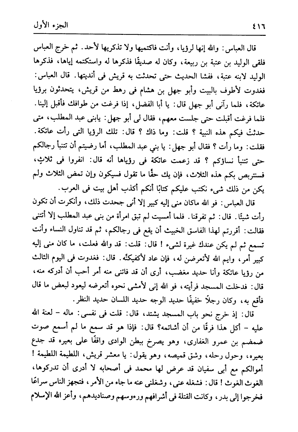 قَالَ الْعَبَّاس وَالله إِنَّهَا لرؤيا وَأَنت فاكتميها وَلَا تذكريها لأحد ثمَّ خرج الْعَبَّاس فلقي الْوَلِيد بن عتبَة بن ربيعَة وَكَانَ لَهُ صديقا فَذكرهَا لَهُ واستكتمه إِيَّاهَا فَذكرهَا الْوَلِيد لِابْنِهِ عتبَة فَفَشَا الحَدِيث حَتَّى تحدثت بِهِ قِرْش فِي أنديتها قَالَ الْعَبَّاس فَغَدَوْت لأَطُوف بِالْبَيْتِ وَأَبُو جهل بن هِشَام فِي رَهْط من قُرَيْش يتحدثون برؤيا عَاتِكَة فَلَمَّا رَآنِي أَبُو جهل قَالَ يَا أَبَا الْفضل إِذا فرغت من طوافك فَأقبل إِلَيْنَا فَلَمَّا فرغت أَقبلت حَتَّى جَلَست مَعَهم فَقَالَ لي أَبُو جهل يَا بني عبد الْمطلب مَتى حدثت فِيكُم هَذِه النبية قلت وَمَا ذَاك قَالَ تِلْكَ الرُّؤْيَا الَّتِي رَأَتْ عَاتِكَة فَقلت وَمَا رَأَتْ فَقَالَ أَبُو جهل يَا بني عبد الْمطلب أما رَضِيتُمْ إِن تتبنأ رجالكم حَتَّى تنبأت نِسَاؤُكُمْ قد زعمت عَاتِكَة فِي رؤياها أَنه قَالَ انفروا فِي ثَلَاث فسنتربص بكم هَذِه الثَّلَاث فَإِن يَك حَقًا مَا تَقول فسيكون وَإِن تمض الثَّلَاث وَلم يكن من ذَلِك شَيْء نكتب عَلَيْكُم كتابا أَنكُمْ أكذب أهل بَيت فِي الْعَرَب قَالَ الْعَبَّاس فوَاللَّه مَا كَانَ مني إِلَيْهِ كَبِير إِلَّا أَنِّي جحدت ذَلِك وَأنْكرت أَن تكون رَأَتْ شَيْئا قَالَ ثمَّ تفرقنا فَلَمَّا أمسيت لم تبْق امْرَأَة من بني عبد الْمطلب إِلَّا أَتَتْنِي فَقَالَت أقررتم لهَذَا الْفَاسِق الْخَبيث أَن يَقع فِي رجالكم ثمَّ قد تنَاول النِّسَاء وَأَنت تسمع ثمَّ لم يكن عنْدك غيرَة لشَيْء قَالَ قلت قد وَالله فعلت مَا كَانَ مني إِلَيْهِ كَبِير أَمر وَايْم الله لأتعرضن لَهُ فَإِن عَاد لأكفيكنه قَالَ فَغَدَوْت فِي الْيَوْم الثَّالِث من رُؤْيا عَاتِكَة وَأَنا حَدِيد مغضب أرى أَن قد فَاتَنِي مِنْهُ أَمر أحب أَن أدْركهُ مِنْهُ قَالَ فَدخلت الْمَسْجِد فرأيته فو الله إِنِّي لأمشي نَحوه أتعرضه ليعود لبَعض مَا قَالَ فأقع بِهِ وَكَانَ رجلا خَفِيفا حَدِيد الْوَجْه حَدِيد اللِّسَان حَدِيد النّظر قَالَ إِذْ خرج نَحْو بَاب الْمَسْجِد يشْتَد قَالَ قلت فِي نَفسِي مَاله لعنة الله عَلَيْهِ أكل هَذَا فرقا من أَن أشاتمه قَالَ فَإِذا هُوَ قد سمع مَا لم أسمع صَوت ضَمْضَم بن عَمْرو الْغِفَارِيّ وَهُوَ يصْرخ بِبَطن الْوَادي وَاقِفًا على بعيره قد جدع بعيره وَحَوله رَحْله وشق قَمِيصه وَهُوَ يَقُول يَا معشر قُرَيْش اللطيمة اللطيمة أَمْوَالكُم مَعَ أبي سُفْيَان قد عرض لَهَا مُحَمَّد فِي أَصْحَابه لَا أَدْرِي أَن تدركوها الْغَوْث الْغَوْث قَالَ فَشَغلهُ عني وشغلني عَنهُ مَا جَاءَ من الْأَمر فتجهز النَّاس سرَاعًا فَخَرجُوا إِلَى بدر وَكَانَت القتلة فِي أَشْرَافهم ورءوسهم وصناديدهم وأعز الله الْإِسْلَام