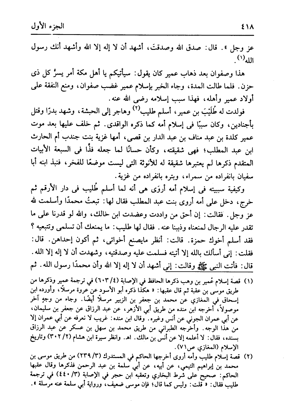 عز وَجل قَالَ صدق الله وصدقت أشهد أَن لَا إِلَه إِلَّا الله وَأشْهد أَنَّك رَسُول الله هَذَا وَصَفوَان بعد ذهَاب عُمَيْر كَانَ يَقُول سَيَأْتِيكُمْ يَا أهل مَكَّة أَمر يسر كل ذِي حزن فَلَمَّا طَالَتْ الْمدَّة وَجَاء الْخَبَر بِإِسْلَام عُمَيْر غضب صَفْوَان وَمنع النَّفَقَة على أَوْلَاد عُمَيْر وَأَهله فَهَذَا سَبَب إِسْلَامه رَضِي الله عَنهُ فَولدت لَهُ طليب بن عُمَيْر أسلم طليب وَهَاجَر إِلَى الْحَبَشَة وَشهد بَدْرًا وَقتل بأجنادين وَكَانَ سَببا فِي إِسْلَام أمه كَمَا ذكره الْوَاقِدِيّ ثمَّ خلف عَلَيْهِ بعد موت عُمَيْر كلدة بن عبد منَاف بن عبد الدَّار بن قصي أمهَا غزيَّة بنت جندت أم الْحَارِث ابْن عبد الْمطلب فَهِيَ شقيقته وَكَأن حسانا لما جعله فَذا فِي السَّبْعَة الأبيات الْمُقدم ذكرهَا لم يَعْتَبِرهَا شَقِيقَة لَهُ للأنوثة الَّتِي لَيست موضعا للفخر فنبذ ابْنه أَبَا سُفْيَان بِانْفِرَادِهِ من سمراء وبتره بِانْفِرَادِهِ من غزيَّة وَكَيْفِيَّة سببيته فِي إِسْلَام أمه أروى هِيَ أَنه لما أسلم طليب فِي دَار الأرقم ثمَّ خرج دخل على أمه أروى بنت عبد الْمطلب فَقَالَ لَهَا تبِعت مُحَمَّدًا وَأسْلمت لله عز وَجل فَقَالَت إِن أَحَق من واددت وعضدت ابْن خَالك وَالله لَو قَدرنَا على مَا تقدر عَلَيْهِ الرِّجَال لمنعناه وذببناه عَنهُ فَقَالَ لَهَا طليب مَا يمنعك أَن تسلمي وتتبعيه فقد أسلم أَخُوك حَمْزَة قَالَت أنظر مَا يصنع أخواتي ثمَّ أكون إِحْدَاهُنَّ قَالَ فَقلت اني اسألك بِاللَّه لَا أَتَيْته فَسلمت عَلَيْهِ وصدقتيه وَشهِدت أَن لَا إِلَه إِلَّا الله قَالَ فَأَتَت النَّبِي