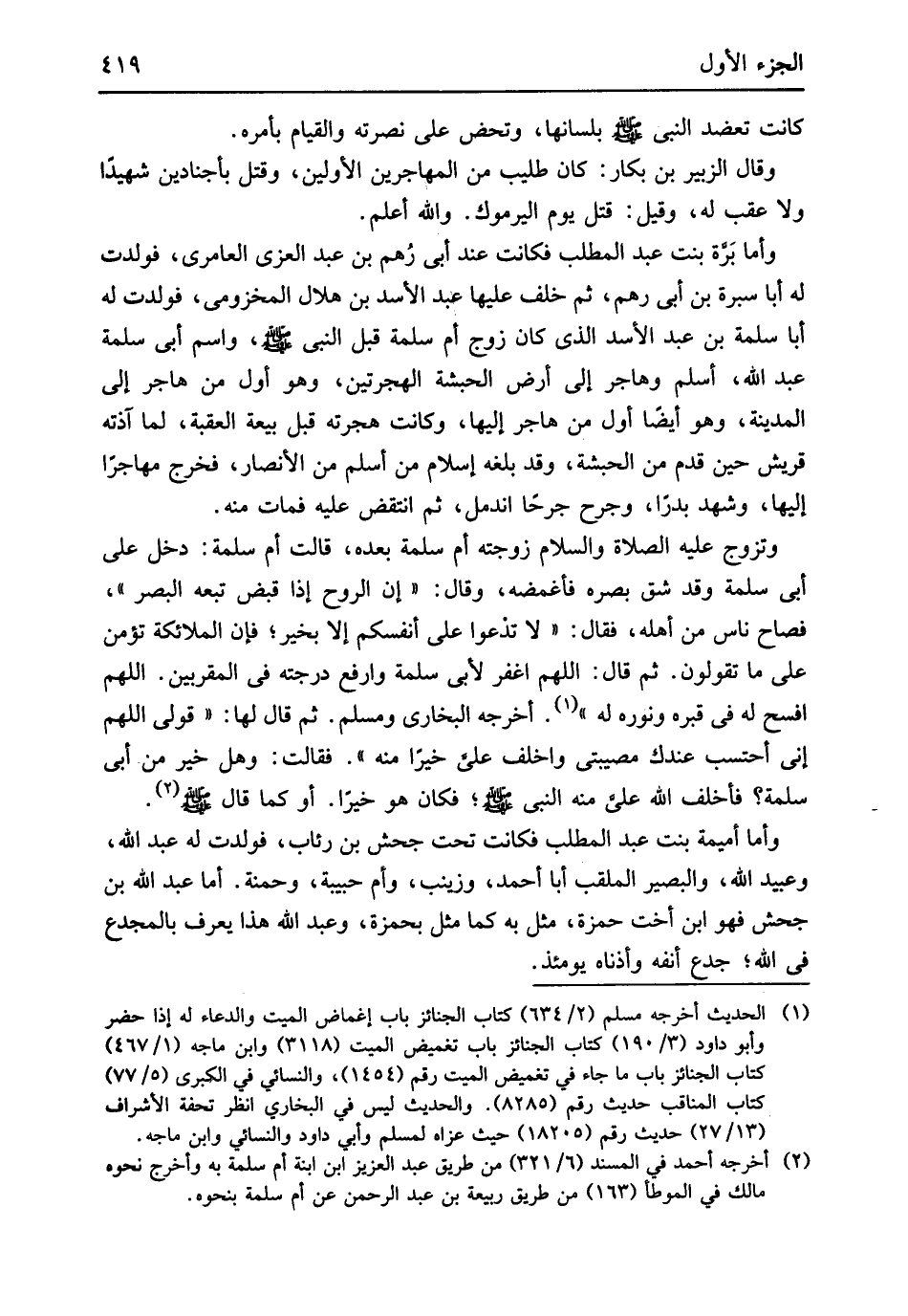 وَاسم أبي سَلمَة عبد الله أسلم وَهَاجَر إِلَى أَرض الْحَبَشَة الهجرتين وَهُوَ أول من هَاجر إِلَى الْمَدِينَة وَهُوَ أَيْضا أول من هَاجر إِلَيْهَا وَكَانَت هجرته قبل بيعَة الْعقبَة لما آذته قُرَيْش حِين قدم من الْحَبَشَة وَقد بلغه إِسْلَام من أسلم من الْأَنْصَار فَخرج مُهَاجرا إِلَيْهَا وَشهد بَدْرًا وجرح جرحا اندمل ثمَّ انْتقض عَلَيْهِ فَمَاتَ مِنْهُ وَتزَوج عَلَيْهِ الصَّلَاة وَالسَّلَام زَوجته أم سَلمَة بعده قَالَت أم سَلمَة دخل عَليّ أبي سَلمَة وَقد شقّ بَصَره فأغمضه وَقَالَ إِن الرّوح إِذا قبض تبعه الْبَصَر فصاح نَاس من أَهله فَقَالَ لَا تدعوا على أَنفسكُم إِلَّا بِخَير فَإِن الْمَلَائِكَة تؤمن على مَا تَقولُونَ ثمَّ قَالَ اللَّهُمَّ اغْفِر لأبي سَلمَة وارفع دَرَجَته فِي المقربين اللَّهُمَّ افسح لَهُ فِي قَبره ونوره لَهُ أخرجه البُخَارِيّ وَمُسلم ثمَّ قَالَ لَهَا قولي اللَّهُمَّ إِنِّي أحتسب عنْدك مصيبتي واخلف عَليّ خيرا مِنْهُ فَقَالَت وَهل خير من أبي سَلمَة فأخلف الله عَليّ مِنْهُ النَّبِي