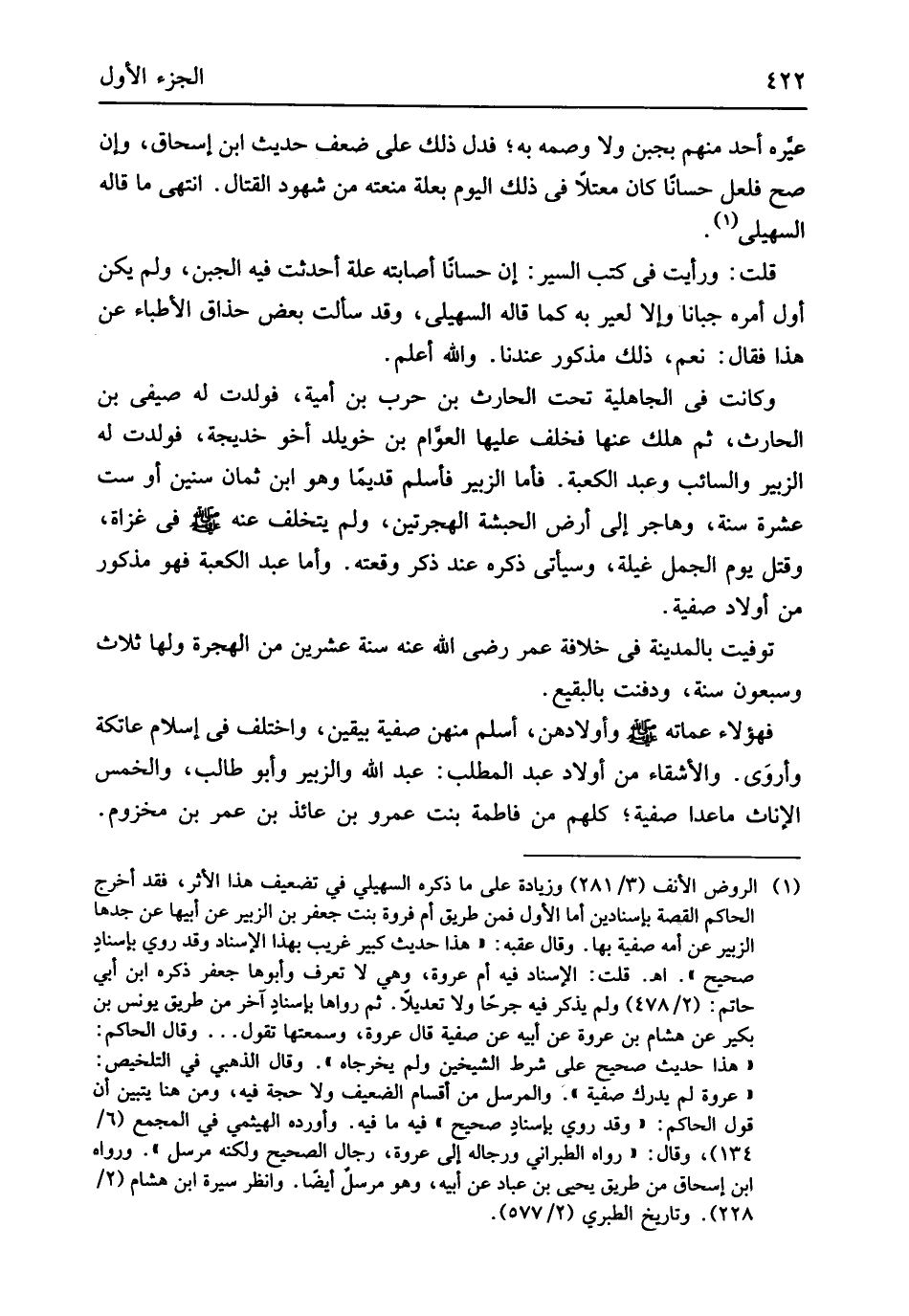 عيره أحد مِنْهُم بجبن وَلَا وصمه بِهِ فَدلَّ ذَلِك على ضعف حَدِيث ابْن إِسْحَاق وَإِن صَحَّ فَلَعَلَّ حسانا كَانَ مُعْتَلًّا فِي ذَلِك الْيَوْم بعلة منعته من شُهُود الْقِتَال انْتهى مَا قَالَه السُّهيْلي قلت وَرَأَيْت فِي كتب السّير إِن حسانا أَصَابَته عِلّة أحدثت فِيهِ الْجُبْن وَلم يكن أول أمره جَبَانًا وَإِلَّا لعير بِهِ كَمَا قَالَه السُّهيْلي وَقد سَأَلت بعض حذاق الْأَطِبَّاء عَن هَذَا فَقَالَ نعم ذَلِك مَذْكُور عندنَا وَالله أعلم وَكَانَت فِي الْجَاهِلِيَّة تَحت الْحَارِث بن حَرْب بن أُميَّة فَولدت لَهُ صَيْفِي بن الْحَارِث ثمَّ هلك عَنْهَا فخلف عَلَيْهَا الْعَوام بن خويلد أَخُو خَدِيجَة فَولدت لَهُ الزبير والسائب وَعبد الْكَعْبَة فَأَما الزبير فَأسلم قَدِيما وَهُوَ ابْن ثَمَان سِنِين أَو سِتّ عشرَة سنة وَهَاجَر إِلَى أَرض الْحَبَشَة الهجرتين وَلم يتَخَلَّف عَنهُ