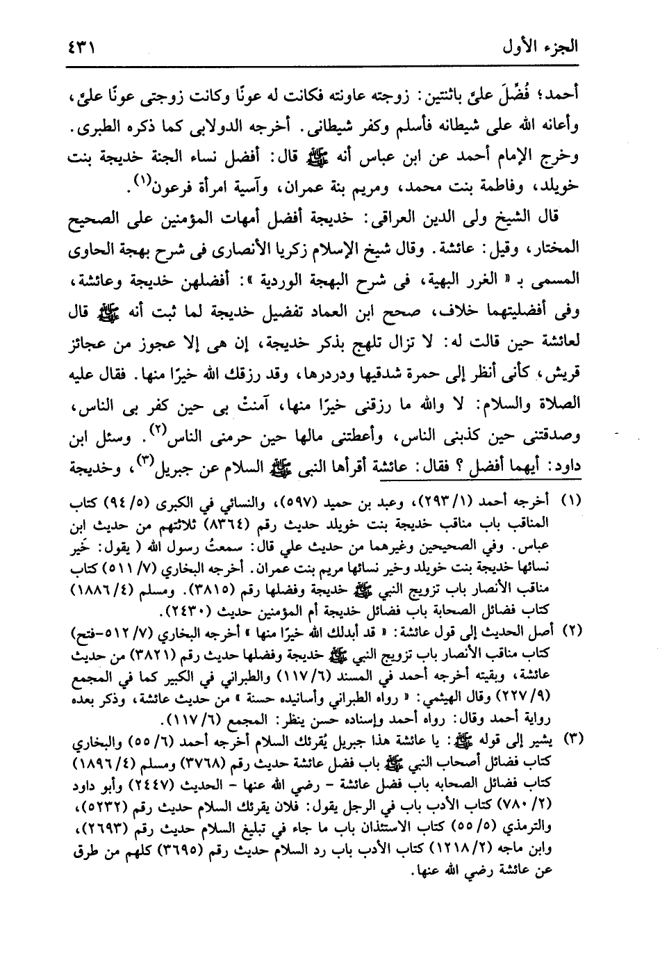 قَالَ أفضل نسَاء الْجنَّة خَدِيجَة بنت خويلد وَفَاطِمَة بنت مُحَمَّد وَمَرْيَم بنة عمرَان وآسية امْرَأَة فِرْعَوْن قَالَ الشَّيْخ ولي الدّين الْعِرَاقِيّ خَدِيجَة أفضل أُمَّهَات الْمُؤمنِينَ على الصَّحِيح الْمُخْتَار وَقيل عَائِشَة وَقَالَ شيخ الْإِسْلَام زَكَرِيَّا الْأنْصَارِيّ فِي شرح بهجة الْحَاوِي الْمُسَمّى بالغرر البهية فِي شرج الْبَهْجَة الوردية أفضلهن خَدِيجَة وَعَائِشَة وَفِي أفضليتهما خلاف صحّح ابْن الْعِمَاد تَفْضِيل خَدِيجَة لما ثَبت أَنه