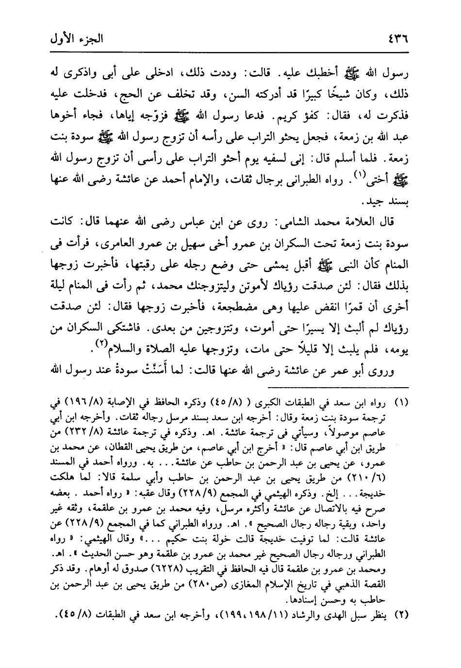 أُخْتِي رَوَاهُ الطَّبَرَانِيّ بِرِجَال ثِقَات وَالْإِمَام أَحْمد عَن عَائِشَة رَضِي الله عَنْهَا بِسَنَد جيد قَالَ الْعَلامَة مُحَمَّد الشَّامي روى عَن ابْن عَبَّاس رَضِي الله عَنْهُمَا قَالَ كَانَت سَوْدَة بنت زَمعَة تَحت السَّكْرَان بن عَمْرو أخي سُهَيْل بن عَمْرو العامري فرأت فِي الْمَنَام كَأَن النَّبِي