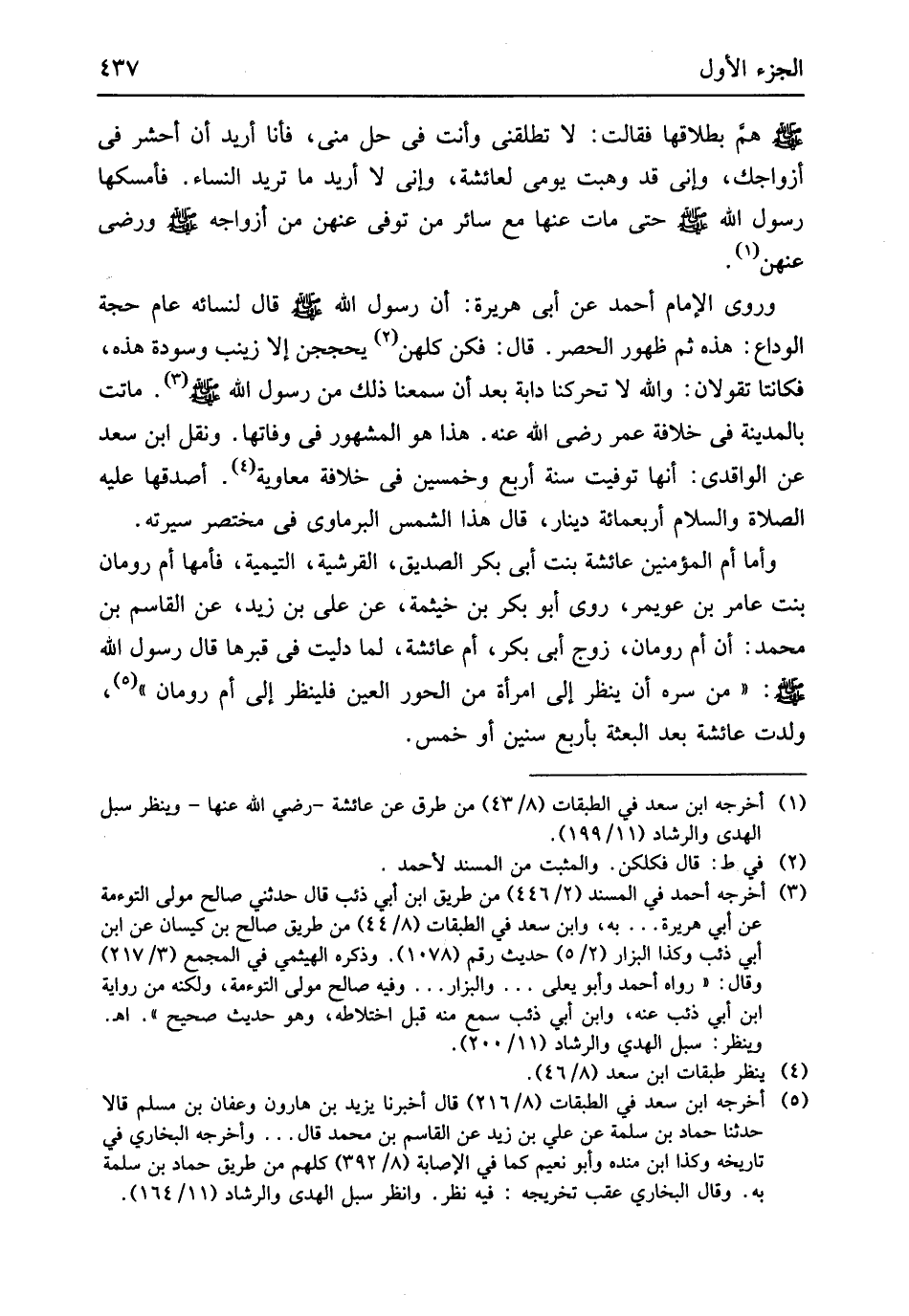 مَاتَت بِالْمَدِينَةِ فِي خلَافَة عمر رَضِي الله عَنهُ هَذَا هُوَ الْمَشْهُور فِي وفاتها وَنقل ابْن سعد عَن الْوَاقِدِيّ أَنَّهَا توفيت سنة أَربع وَخمسين فِي خلَافَة مُعَاوِيَة أصدقهَا عَلَيْهِ الصَّلَاة وَالسَّلَام أَرْبَعمِائَة دِينَار قَالَ هَذَا الشَّمْس الْبرمَاوِيّ فِي مُخْتَصر سيرته وَأما أم الْمُؤمنِينَ عَائِشَة بنت أبي بكر الصّديق القرشية التيمية فأمها أم رُومَان بنت عَامر بن عُوَيْمِر روى أَبُو بكر بن خَيْثَمَة عَن عَليّ بن زيد عَن الْقَاسِم بن مُحَمَّد أَن أم رُومَان زوج أبي بكر أم عَائِشَة لما دليت فِي قبرها قَالَ رَسُول الله