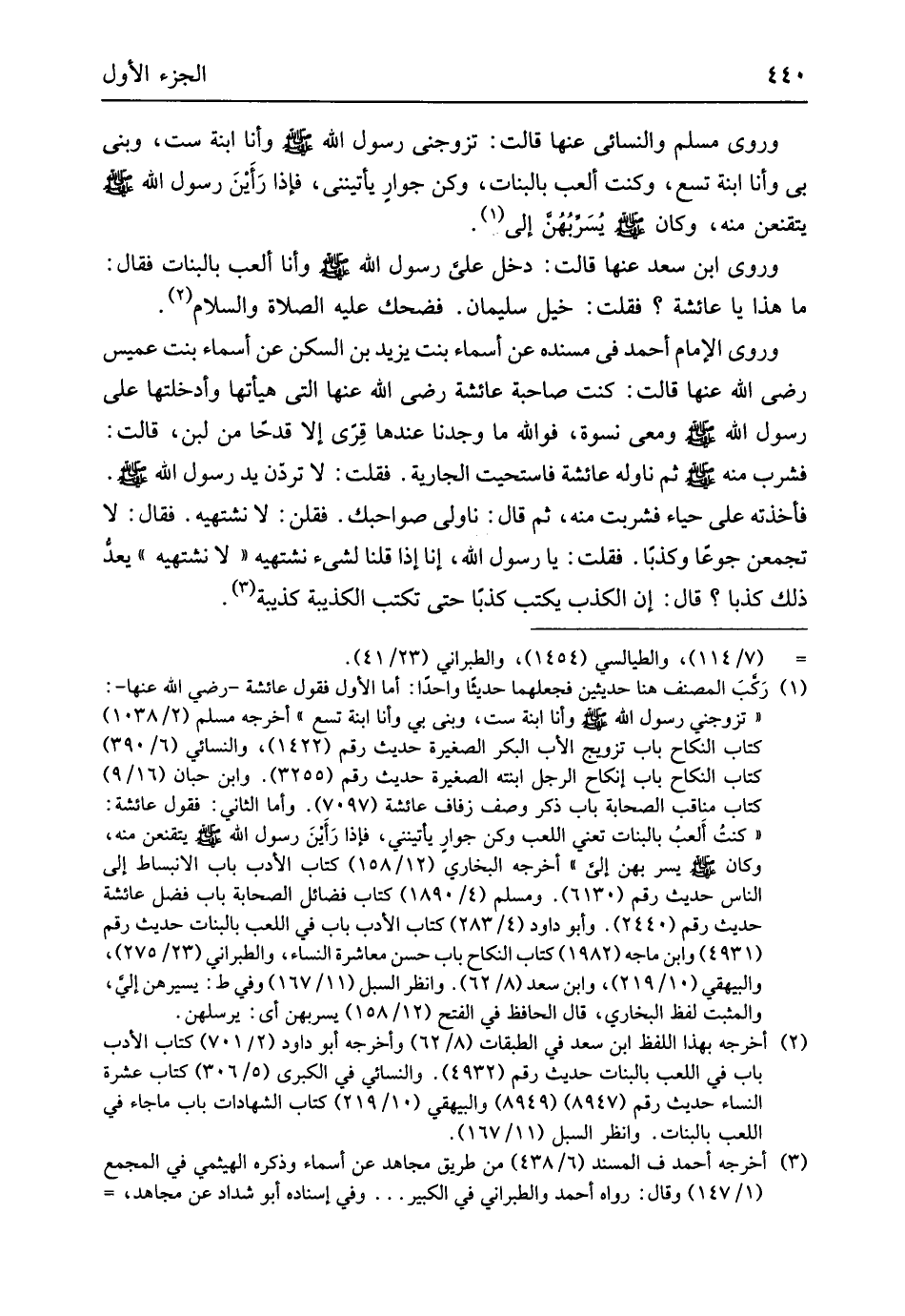 وَأَنا أَلعَب بالبنات فَقَالَ مَا هَذَا يَا عَائِشَة فَقلت خيل سُلَيْمَان فَضَحِك عَلَيْهِ الصَّلَاة وَالسَّلَام وروى الإِمَام أَحْمد فِي مُسْنده عَن أَسمَاء بنت يزِيد بن السكن عَن أَسمَاء بنت عُمَيْس رَضِي الله عَنْهَا قَالَت كنت صَاحِبَة عَائِشَة رَضِي الله عَنْهَا الَّتِي هيأتها وادخلتها على رَسُول الله