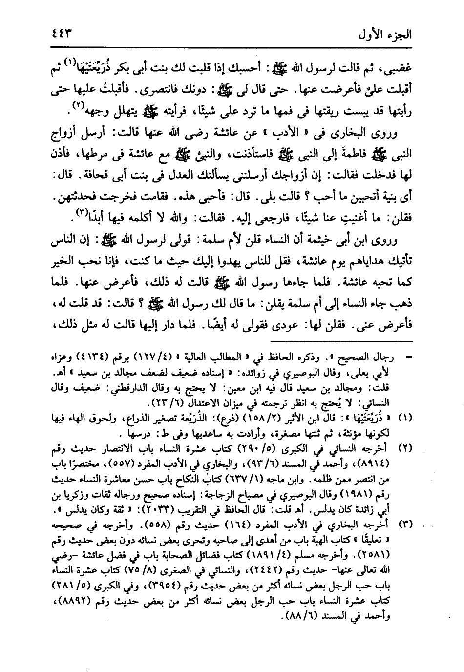مَعَ عَائِشَة فِي مرْطهَا فَأذن لَهَا فَدخلت فَقَالَت إِن أَزوَاجك أرسلنني يسألنك الْعدْل فِي بنت أبي قُحَافَة قَالَ أَي بنية أتحبين مَا أحب قَالَت بلَى قَالَ فأحبي هَذِه فَقَامَتْ فَخرجت فحدثتهن فَقُلْنَ مَا أغنيت عَنَّا شَيْئا فارجعي إِلَيْهِ فَقَالَت وَالله لَا ُأكَلِّمهُ فِيهَا أبدا وروى ابْن أبي خَيْثَمَة أَن النِّسَاء قُلْنَ لأم سَلمَة قولي لرَسُول الله