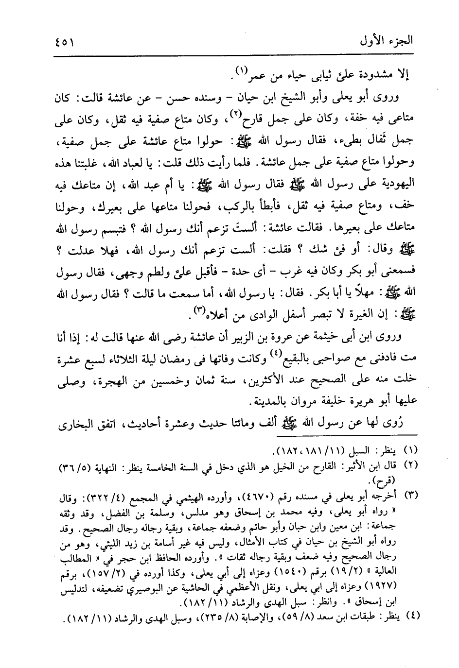 إِلَّا مشدودة عَليّ ثِيَابِي حَيَاء من عمر وروى أَبُو يعلى وَأَبُو الشَّيْخ ابْن حَيَّان وَسَنَده حسن عَن عَائِشَة قَالَت كَانَ متاعي فِيهِ خفَّة وَكَانَ على جمل قارح وَكَانَ مَتَاع صَفِيَّة فِيهِ ثقل وَكَانَ على جمل ثفال بطيء فَقَالَ رَسُول الله