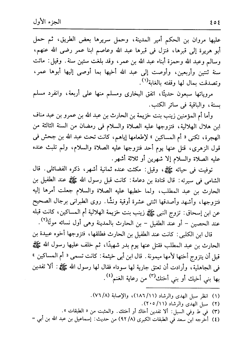 عَلَيْهَا مَرْوَان بن الحكم أَمِير الْمَدِينَة وَحمل سريرها بعض الطَّرِيق ثمَّ حمل أَبُو هُرَيْرَة إِلَى قبرها فَنزل فِي قبرها عبد الله وَعَاصِم ابْنا عمر رَضِي الله عَنْهُم وَسَالم وَعبد الله وَحَمْزَة أَبنَاء عبد الله بن عمر وَقد بلغت سِتِّينَ سنة وَقيل مَاتَت سنة ثِنْتَيْنِ وَأَرْبَعين وأوصت إِلَى عبد الله أَخِيهَا بِمَا أوصى إِلَيْهَا أَبوهَا عمر وتصدقت بِمَال لَهَا وقفته بِالْغَابَةِ مروياتها سَبْعُونَ حَدِيثا اتّفق البُخَارِيّ وَمُسلم مِنْهَا على أَرْبَعَة وَانْفَرَدَ مُسلم بِسِتَّة والباقية فِي سَائِر الْكتب وَأما أم الْمُؤمنِينَ زَيْنَب بنت خُزَيْمَة بن الْحَارِث بن عبد الله بن عَمْرو بن عبد منَاف ابْن هِلَال الْهِلَالِيَّة فَتَزَوجهَا عَلَيْهِ الصَّلَاة وَالسَّلَام فِي رَمَضَان من السّنة الثَّالِثَة من الْهِجْرَة تكنى أم الْمَسَاكِين لإطعامها إيَّاهُم كَانَت تَحت عبد الله بن جحش فِي قَول الزُّهْرِيّ قتل عَنْهَا يَوْم أحد فَتَزَوجهَا عَلَيْهِ الصَّلَاة وَالسَّلَام وَلم تلبث عِنْده عَلَيْهِ الصَّلَاة وَالسَّلَام إِلَّا شَهْرَيْن أَو ثَلَاثَة أشهر توفيت فِي حَيَاته