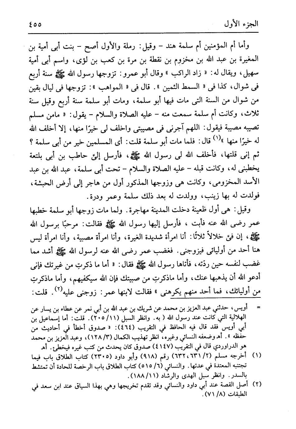 وَأما أم الْمُؤمنِينَ أم سَلمَة هِنْد وَقيل رَملَة وَالْأول أصح بنت أبي أُميَّة بن الْمُغيرَة بن عبد الله بن مَخْزُوم بن نقطة بن مرّة بن كَعْب بن لؤَي وَاسم أبي أُميَّة سُهَيْل وَيُقَال لَهُ زَاد الرَّاكِب وَقَالَ أَبُو عَمْرو تزَوجهَا رَسُول الله