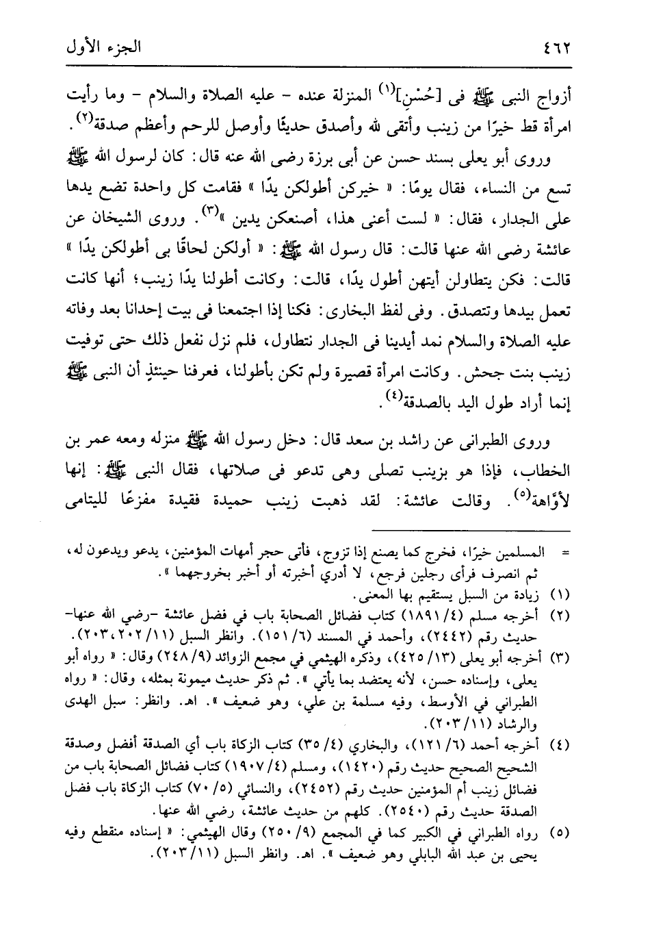 تسع من النِّسَاء فَقَالَ يَوْمًا خيركن أَطْوَلكُنَّ يدا فَقَامَتْ كل وَاحِدَة تضع يَدهَا على الْجِدَار فَقَالَ لست أَعنِي هَذَا أصنعكن يدين وروى الشَّيْخَانِ عَن عَائِشَة رَضِي الله عَنْهَا قَالَت قَالَ رَسُول الله