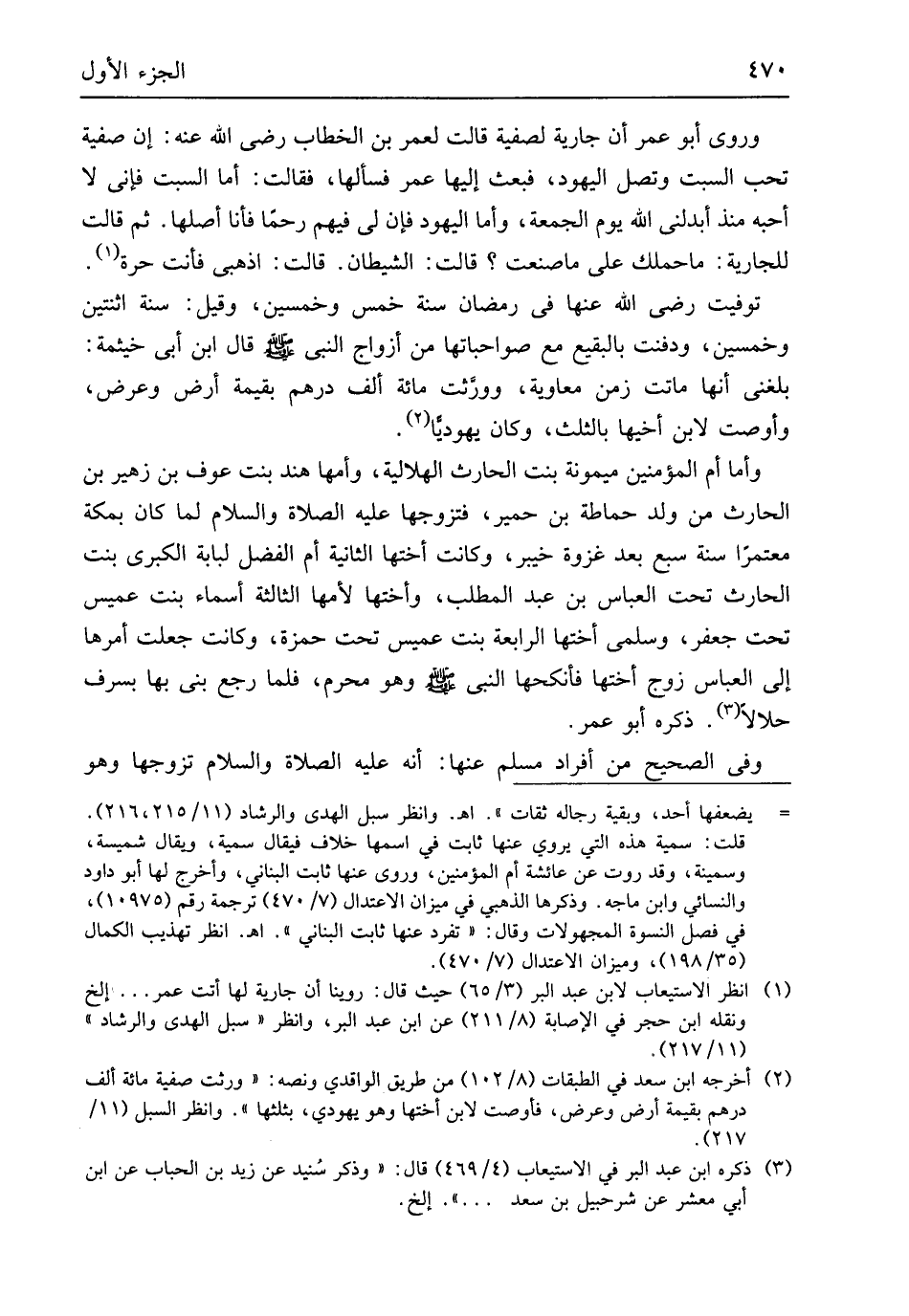 قَالَ ابْن أبي خَيْثَمَة بَلغنِي أَنَّهَا مَاتَت زمن مُعَاوِيَة وورثت مائَة ألف دِرْهَم بِقِيمَة أَرض وَعرض وأوصت لِابْنِ أَخِيهَا بِالثُّلثِ وَكَانَ يَهُودِيّا وَأما أم الْمُؤمنِينَ مَيْمُونَة بنت الْحَارِث الْهِلَالِيَّة وَأمّهَا هِنْد بنت عَوْف بن زُهَيْر بن الْحَارِث من ولد حماطة بن حمير فَتَزَوجهَا عَلَيْهِ الصَّلَاة وَالسَّلَام لما كَانَ بِمَكَّة مُعْتَمِرًا سنة سبع بعد غَزْوَة خَيْبَر وَكَانَت أُخْتهَا الثَّانِيَة أم الْفضل لبَابَة الْكُبْرَى بنت الْحَارِث تَحت الْعَبَّاس بن عبد الْمطلب وَأُخْتهَا لأمها الثَّالِثَة أَسمَاء بنت عُمَيْس تَحت جَعْفَر وسلمى أُخْتهَا الرَّابِعَة بنت عُمَيْس تَحت حَمْزَة وَكَانَت جعلت أمرهَا إِلَى الْعَبَّاس زوج أُخْتهَا فَأَنْكحهَا النَّبِي