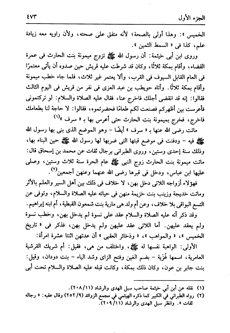 تزوج مَيْمُونَة بنت الْحَارِث فِي عمْرَة الْقَضَاء وَأقَام بِمَكَّة ثَلَاثًا وَكَانَ قد شرطت عَلَيْهِ قُرَيْش حِين صدوه أَن يَأْتِي مُعْتَمِرًا فِي الْعَام الْقَابِل السيوف فِي الْقرب وَألا يعْتَمر غير ثَلَاث فَلَمَّا جَاءَ خطب مَيْمُونَة وَأقَام بِمَكَّة ثَلَاثَة وَأَتَاهُ حويطب بن عبد الْعُزَّى فِي نفر من قُرَيْش فِي الْيَوْم الثَّالِث فَقَالُوا إِنَّه قد انْقَضى أَجلك فَاخْرُج عَنَّا فَقَالَ عَلَيْهِ الصَّلَاة وَالسَّلَام لَو تركتموني فأعرست بَين أظْهركُم فصنعت لكم طَعَاما فحضرتموه فَقَالُوا لَا حَاجَة لنا بطعامك فَاخْرُج فَخرج بميمونة بنت الْحَارِث حَتَّى أعرس بهَا بسرف مَاتَت رَضِي الله عَنْهَا بسرف أَيْضا وَهُوَ الْموضع الَّذِي بنى بهَا رَسُول الله