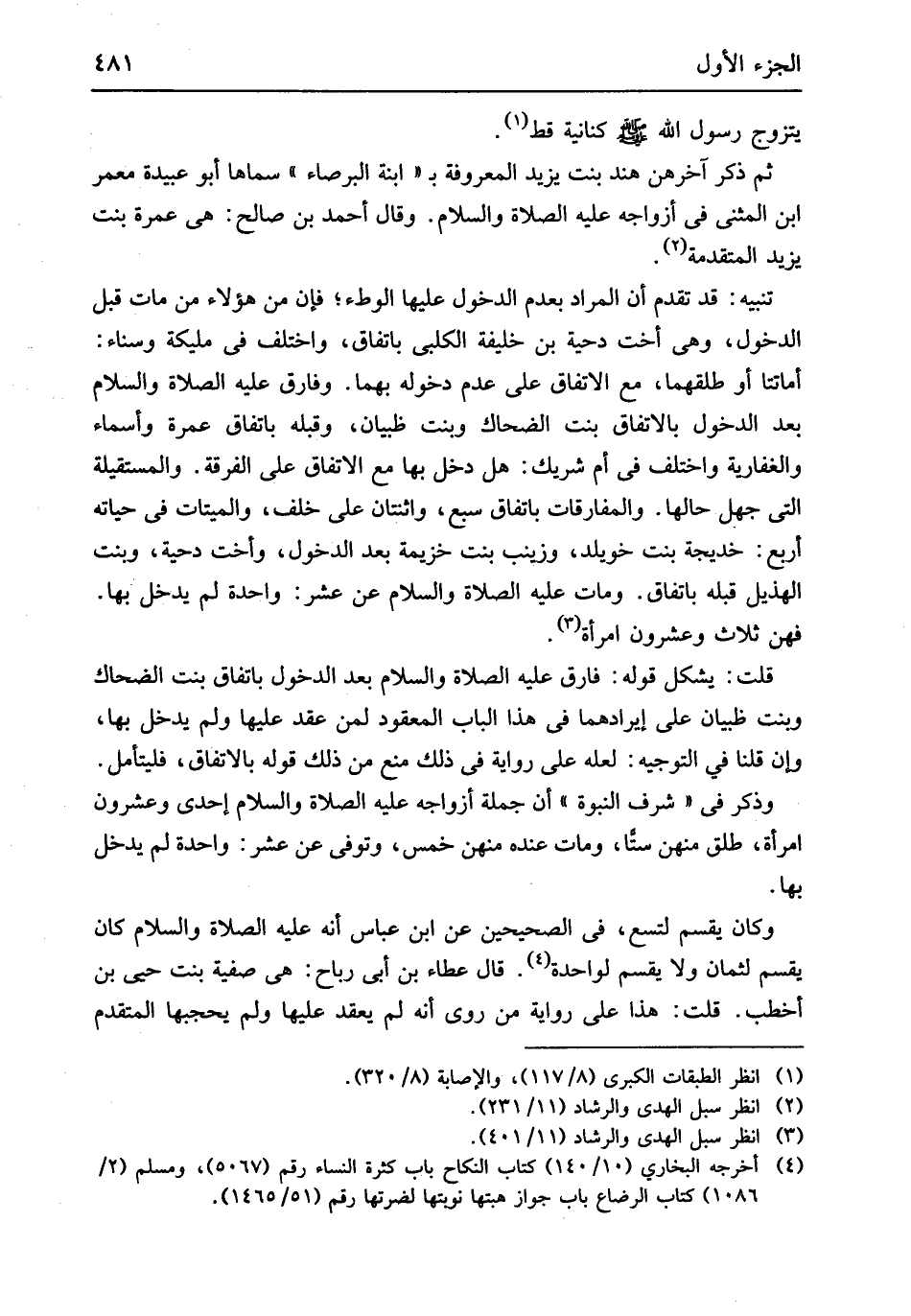كنانية قطّ ثمَّ ذكر آخِرهنَّ هِنْد بنت يزِيد الْمَعْرُوفَة بابنة البرصاء سَمَّاهَا أَبُو عيبدة معمر ابْن الْمثنى فِي أَزوَاجه عَلَيْهِ الصَّلَاة وَالسَّلَام وَقَالَ أَحْمد بن صَالح هِيَ عمْرَة بنت يزِيد الْمُتَقَدّمَة تَنْبِيه قد تقدم أَن المُرَاد بِعَدَمِ الدُّخُول عَلَيْهَا الْوَطْء فَإِن من هَؤُلَاءِ من مَاتَ قبل الدُّخُول وَهِي أُخْت دحْيَة بن خَليفَة الْكَلْبِيّ بِاتِّفَاق وَاخْتلف فِي مليكَة وسناء أماتتا أَو طلقهما مَعَ الِاتِّفَاق على عدم الدُّخُول بهما وَفَارق عَلَيْهِ الصَّلَاة وَالسَّلَام بعد الدُّخُول بالِاتِّفَاقِ بنت الضَّحَّاك وَبنت ظبْيَان وَقَبله بِاتِّفَاق عمْرَة وَأَسْمَاء والغفارية وَاخْتلف فِي أم شريك هَل دخل بهَا مَعَ الِاتِّفَاق على الْفرْقَة والمستقيلة الَّتِي جهل حَالهَا والمفارقات بِاتِّفَاق سبع وَاثْنَتَانِ على خلف وَالْمَيتَات فِي حَيَاته أَربع خَدِيجَة بنت خويلد وَزَيْنَب بنت خُزَيْمَة بعد الدُّخُول وَأُخْت دحْيَة وَبنت الْهُذيْل قبله بِاتِّفَاق وَمَات عَلَيْهِ الصَّلَاة وَالسَّلَام عَن عشرَة وَاحِدَة لم يدْخل بهَا فهن ثَلَاث وَعِشْرُونَ امْرَأَة قلت يشكل قَوْله فَارق عَلَيْهِ الصَّلَاة وَالسَّلَام بعد الدُّخُول بِاتِّفَاق بنت الضَّحَّاك وَبنت ظبْيَان على إيرادهما فِي هَذَا الْبَاب الْمَعْقُود لمن عقد عَلَيْهَا وَلم يدْخل بهَا وَإِن قُلْنَا فِي التَّوْجِيه لَعَلَّه على رِوَايَة فِي ذَلِك منع من ذَلِك قَوْله بالِاتِّفَاقِ فَلْيتَأَمَّل وَذكر فِي شرف النُّبُوَّة أَن جملَة أَزوَاجه عَلَيْهِ الصَّلَاة وَالسَّلَام إِحْدَى وَعِشْرُونَ امْرَأَة طلق مِنْهُنَّ سِتا وَمَات عِنْده مِنْهُنَّ خمس وَتُوفِّي عَن عشر وَاحِدَة لم يدْخل بهَا وَكَانَ يقسم لتسْع فِي الصَّحِيحَيْنِ عَن ابْن عَبَّاس أَنه عَلَيْهِ الصَّلَاة وَالسَّلَام كَانَ يقسم لثمان وَلَا يقسم لوَاحِدَة قَالَ عَطاء بن أبي رَبَاح هِيَ صَفِيَّة بنت حييّ بن أَخطب قلت هَذَا على رِوَايَة من روى أَنه لم يعْقد عَلَيْهَا وَلم يحجبها الْمُتَقَدّم