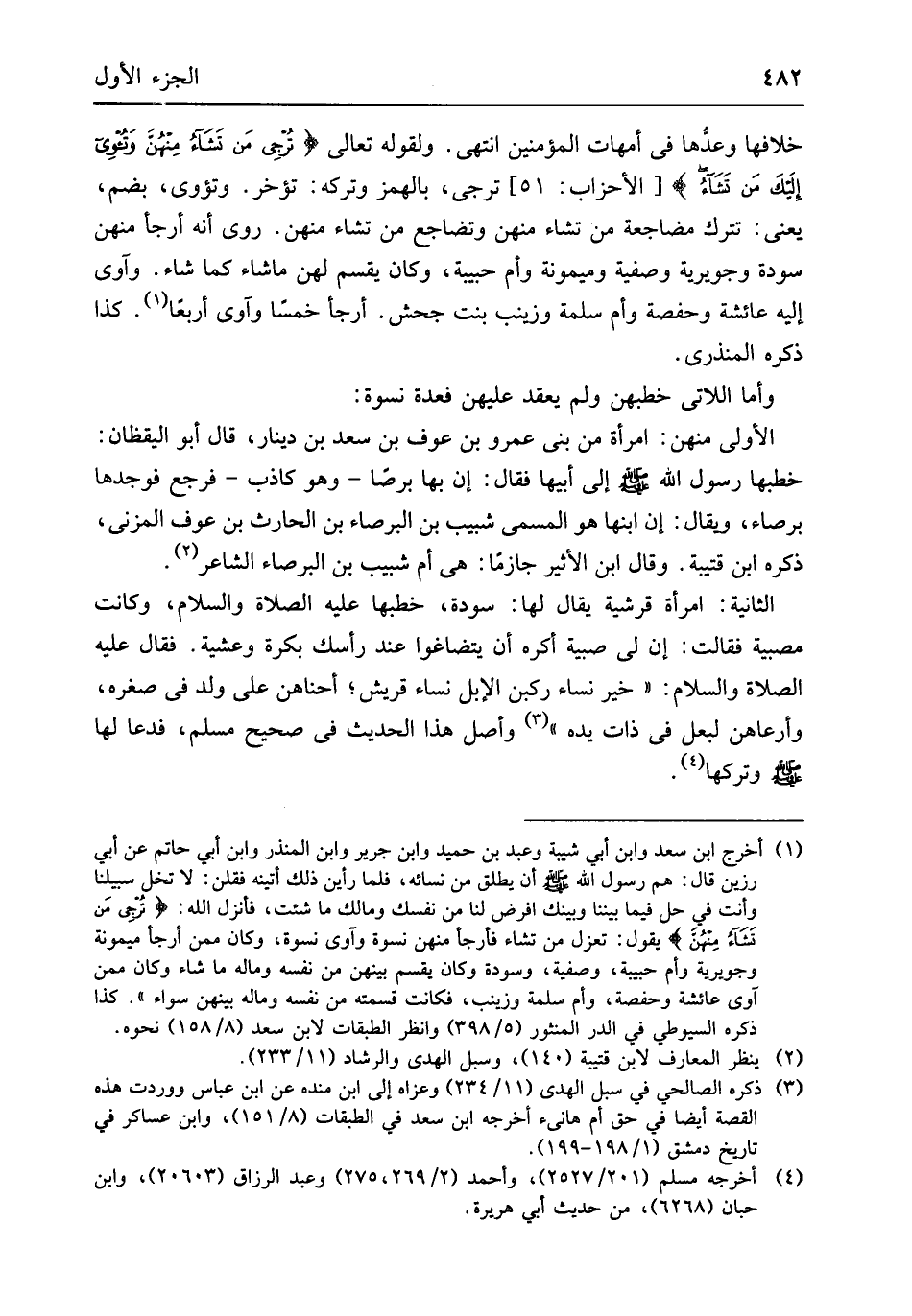 خلَافهَا وعدها فِي أُمَّهَات الْمُؤمنِينَ انْتهى وَلقَوْله تَعَالَى {تُرْجِى مَن تَشَاءُ مِنْهُنَّ وَتُئْوِي إِلَيْكَ مَن تَشَاءُ} الْأَحْزَاب 51 ترجى بِالْهَمْز وَتَركه تُؤخر وَتُؤْوِي بِضَم يَعْنِي تتْرك مضاجعة من تشَاء مِنْهُنَّ وتضاجع من تشَاء مِنْهُنَّ روى أَنه أرجأ مِنْهُنَّ سَوْدَة وَجُوَيْرِية وَصفِيَّة ومَيْمُونَة وَأم حَبِيبَة وَكَانَ يقسم لَهُنَّ مَا شَاءَ كَمَا شَاءَ وَأَوَى إِلَيْهِ عَائِشَة وَحَفْصَة وَأم سَلمَة وَزَيْنَب بنت جحش أرجأ خمْسا وآوى أَرْبعا كَذَا ذكره الْمُنْذِرِيّ وَأما اللَّاتِي خطبهن وَلم يعْقد عَلَيْهِنَّ فَعدَّة نسْوَة الأولى مِنْهُنَّ امْرَأَة من بني عَمْرو بن عَوْف بن سعد بن دِينَار قَالَ أَبُو الْيَقظَان خطبهَا رَسُول الله