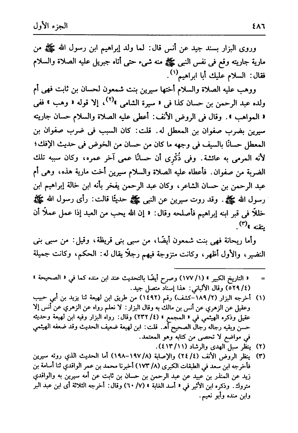 مِنْهُ شَيْء حَتَّى أَتَاهُ جِبْرِيل عَلَيْهِ الصَّلَاة وَالسَّلَام فَقَالَ السَّلَام عَلَيْك يَا أَبَا إِبْرَاهِيم ووهب عَلَيْهِ الصَّلَاة وَالسَّلَام أُخْتهَا سِيرِين بنت شَمْعُون لحسان بن ثَابت فَهِيَ أم وَلَده عبد الرَّحْمَن بن حسان كَذَا فِي سيرة الشَّامي إِلَّا قَوْله وهب فَفِي الْمَوَاهِب وَقَالَ فِي الرَّوْض الْأنف أعْطى عَلَيْهِ الصَّلَاة وَالسَّلَام حسان جَارِيَته سِيرِين بِضَرْب صَفْوَان بن الْمُعَطل لَهُ قلت كَانَ السَّبَب فِي ضرب صَفْوَان بن الْمُعَطل حسانا بِالسَّيْفِ فِي وَجهه مَا كَانَ من حسان من الْخَوْض فِي حَدِيث الْإِفْك لِأَنَّهُ المرمي بِهِ عَائِشَة وَفِي ذكرى أَن حسانا عمى آخر عمره وَكَانَ سَببه تِلْكَ الضَّرْبَة من صَفْوَان فَأعْطَاهُ عَلَيْهِ الصَّلَاة وَالسَّلَام سِيرِين أُخْت مَارِيَة هَذِه وَهِي أم عبد الرَّحْمَن بن حسان الشَّاعِر وَكَانَ عبد الرَّحْمَن يفخر بِأَنَّهُ ابْن خَالَة إِبْرَاهِيم ابْن رَسُول الله