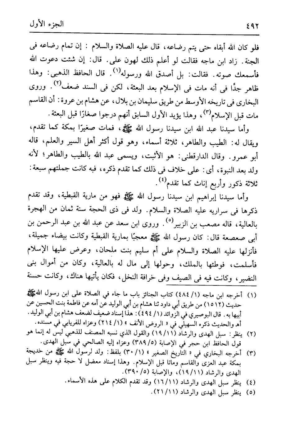 فَلَو كَانَ الله أبقاه حَتَّى يتم رضاعه قَالَ عَلَيْهِ الصَّلَاة وَالسَّلَام إِن تَمام رضاعه فِي الْجنَّة زَاد ابْن مَاجَه فَقَالَت لَو أعلم ذَلِك لهون عَليّ قَالَ إِن شِئْت دَعَوْت الله فأسمعك صَوته فَقَالَت بل أصدق الله وَرَسُوله قَالَ الْحَافِظ الذَّهَبِيّ وَهَذَا ظَاهر جدا فِي أَنه مَاتَ فِي الْإِسْلَام بعد الْبعْثَة لَكِن فِي السَّنَد ضعف وروى البُخَارِيّ فِي تَارِيخه الْأَوْسَط من طَرِيق سُلَيْمَان بن بِلَال عَن هِشَام بن عُرْوَة أَن الْقَاسِم مَاتَ قبل الْإِسْلَام وَهَذَا يُؤَيّد الأول السَّابِق أَنهم درجوا صغَارًا قبل الْبعْثَة وَأما سيدنَا عبد الله ابْن سيدنَا رَسُول الله