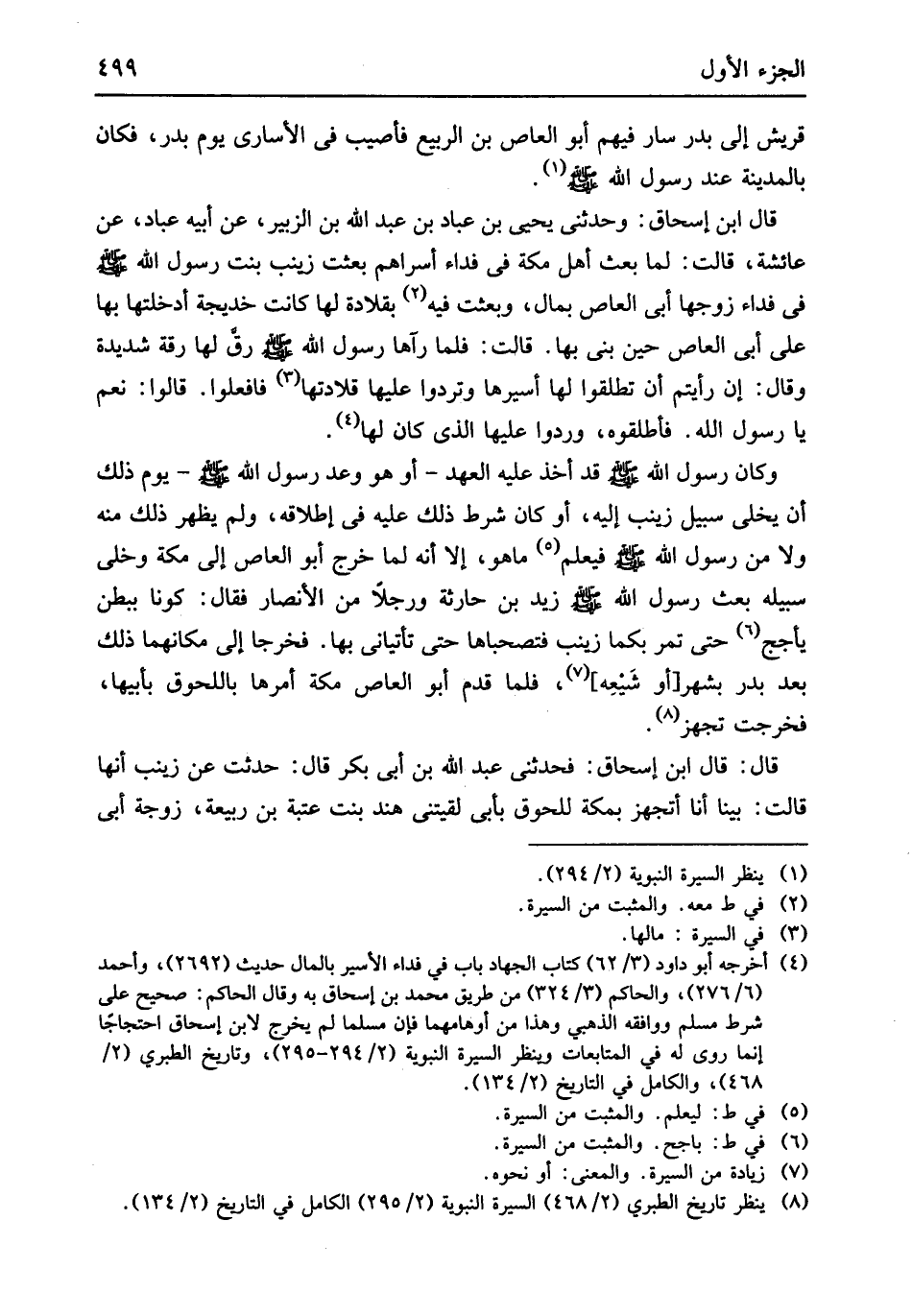 زيد بن حَارِثَة ورجلا من الاعصار فَقَالَ كونا بِبَطن يأجج حَتَّى تمر بكما زَيْنَب فتصحباها حَتَّى تأتياني بهَا فَخَرَجَا إِلَى مكانهما ذَلِك بعد بدر بِشَهْر أَو شيعه فَلَمَّا قدم أَبُو الْعَاصِ مَكَّة أمرهَا باللحوق بأبيها فخجرت تجهز قَالَ قَالَ ابْن إِسْحَاق فَحَدثني عبد الله بن أبي بكر قَالَ حدثت عَن زَيْنَب انها قَالَت بَيْنَمَا أَنا أتجهز بِمَكَّة للحوق بِأبي لقيتني هِنْد بنت عتبَة بن ربيعَة زَوْجَة أبي