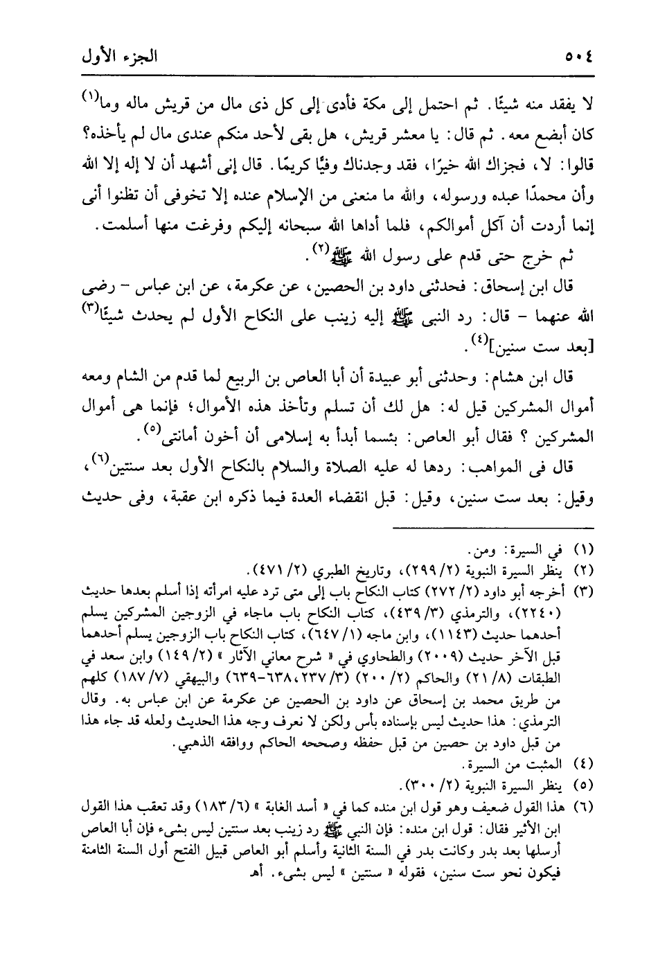 إِلَيْهِ زَيْنَب على النِّكَاح الأول لم يحدث شَيْئا بعد سِتّ سِنِين قَالَ ابْن هِشَام وحَدثني أَبُو عُبَيْدَة أَن أَبَا الْعَاصِ بن الرّبيع لما قدم من الشَّام وَمَعَهُ أَمْوَال الْمُشْركين قيل لَهُ هَل لَك أَن تسلم وَتَأْخُذ هَذِه الْأَمْوَال فانما هِيَ أَمْوَال الْمُشْركين فَقَالَ أَبُو الْعَاصِ بئْسَمَا أبدأ بِهِ إسلامي أَن أخون أمانتي قَالَ فِي الْمَوَاهِب ردهَا لَهُ عَلَيْهِ الصَّلَاة وَالسَّلَام بِالنِّكَاحِ الأول بعد سنتَيْن وَقيل بعد سِتّ سِنِين وَقيل قبل انْقِضَاء الْعدة فِيمَا ذكره ابْن عقبَة وَفِي حَدِيث