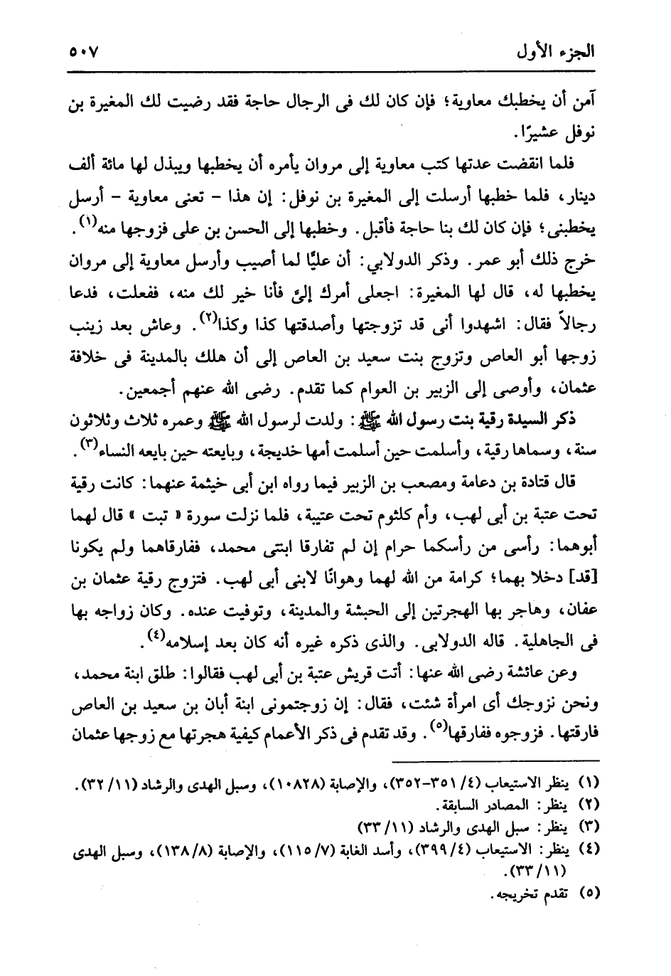 آمن أَن يخطبك مُعَاوِيَة فَإِن كَانَ لَك فِي الرِّجَال حَاجَة فقد رضيت لَك الْمُغيرَة بن نَوْفَل عشيراً فَلَمَّا انْقَضتْ عدتهَا كتب مُعَاوِيَة إِلَى مَرْوَان يَأْمُرهُ أَن يخطبها ويبذل لَهَا مائَة ألف دِينَار فَلَمَّا خطبهَا أرْسلت إِلَى الْمُغيرَة بن نَوْفَل إِن هَذَا تَعْنِي مُعَاوِيَة أرسل يخطبني فَإِن كَانَ لَك بِنَا حَاجَة فَأقبل وخطبها إِلَى الْحُسَيْن بن عَليّ فَزَوجهَا مِنْهُ خرج ذَلِك أَبُو عمر وَذكر الدولابي أَن عليا لما أُصِيب وَأرْسل مُعَاوِيَة إِلَى مَرْوَان يخطبها لَهُ قَالَ لَهَا الْمُغيرَة اجعلي أَمرك إِلَيّ فَأَنا خير لَك مِنْهُ فَفعلت فَدَعَا رجَالًا فَقَالَ اشْهَدُوا أَنِّي قد تَزَوَّجتهَا وأصدقتها كَذَا وَكَذَا وعاش بعد زَيْنَب زَوجهَا أَبُو الْعَاصِ وَتزَوج بنت سعيد بن الْعَاصِ إِلَى أَن هلك بِالْمَدِينَةِ فِي خلَافَة عُثْمَان وَأوصى إِلَى الزبير بن الْعَوام كَمَا تقدم رَضِي الله عَنْهُم أَجْمَعِينَ ذكر السيدة رقية بنت رَسُول الله