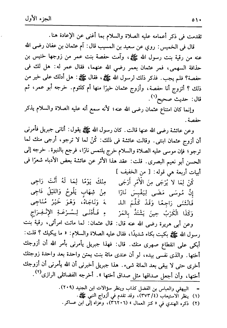 هَل أدلك على خير من ذَلِك أَتزوّج أَنا حَفْصَة وأزوج عُثْمَان خيرا مِنْهَا أم كُلْثُوم خرجه أَبُو عمر ثمَّ قَالَ حَدِيث صَحِيح وَإِنَّمَا كَانَ امْتنَاع عُثْمَان رَضِي الله عَنهُ لِأَنَّهُ سمع أَنه عَلَيْهِ الصَّلَاة وَالسَّلَام يذكر حَفْصَة وَعَن عَائِشَة رَضِي الله عَنْهَا قَالَت كَانَ رَسُول الله