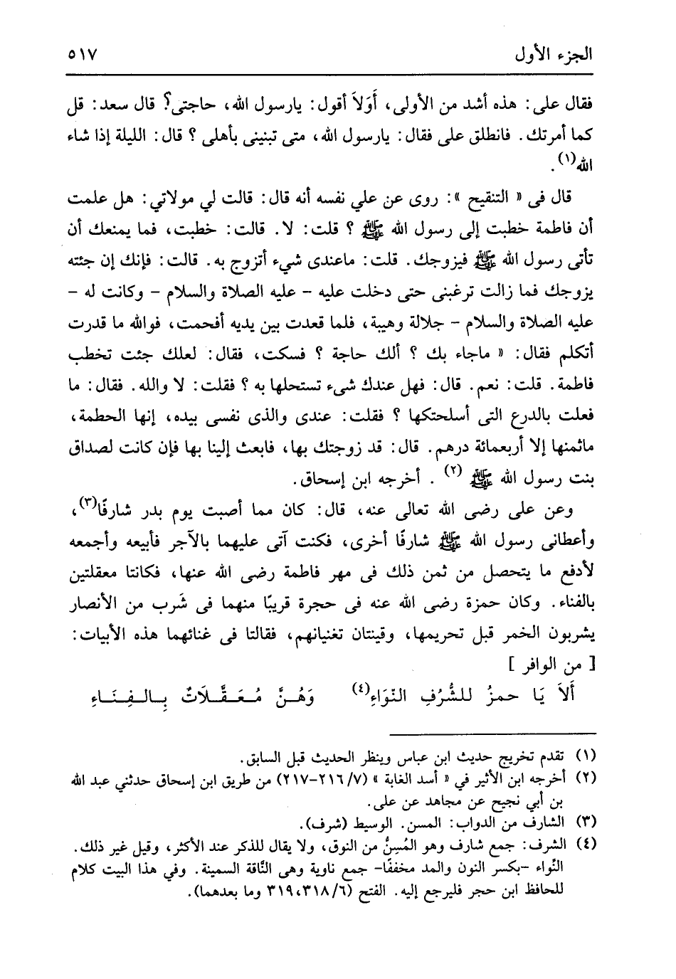 شارفاً أُخْرَى فَكنت آتِي عَلَيْهِمَا بالآجر فأبيعه وأجمعه لأدفع مَا يتَحَصَّل من ثمن ذَلِك فِي مهر فَاطِمَة رَضِي الله عَنْهَا فكانتا معلقتين بالفناء وَكَانَ حَمْزَة رَضِي الله عَنهُ فِي حجرَة قَرِيبا مِنْهُمَا فِي شرب من الْأَنْصَار يشربون الْخمر قبل تَحْرِيمهَا وقينتان تغنيانهم فَقَالَتَا فِي غنائهما هَذِه الأبيات // (من الوافر) //