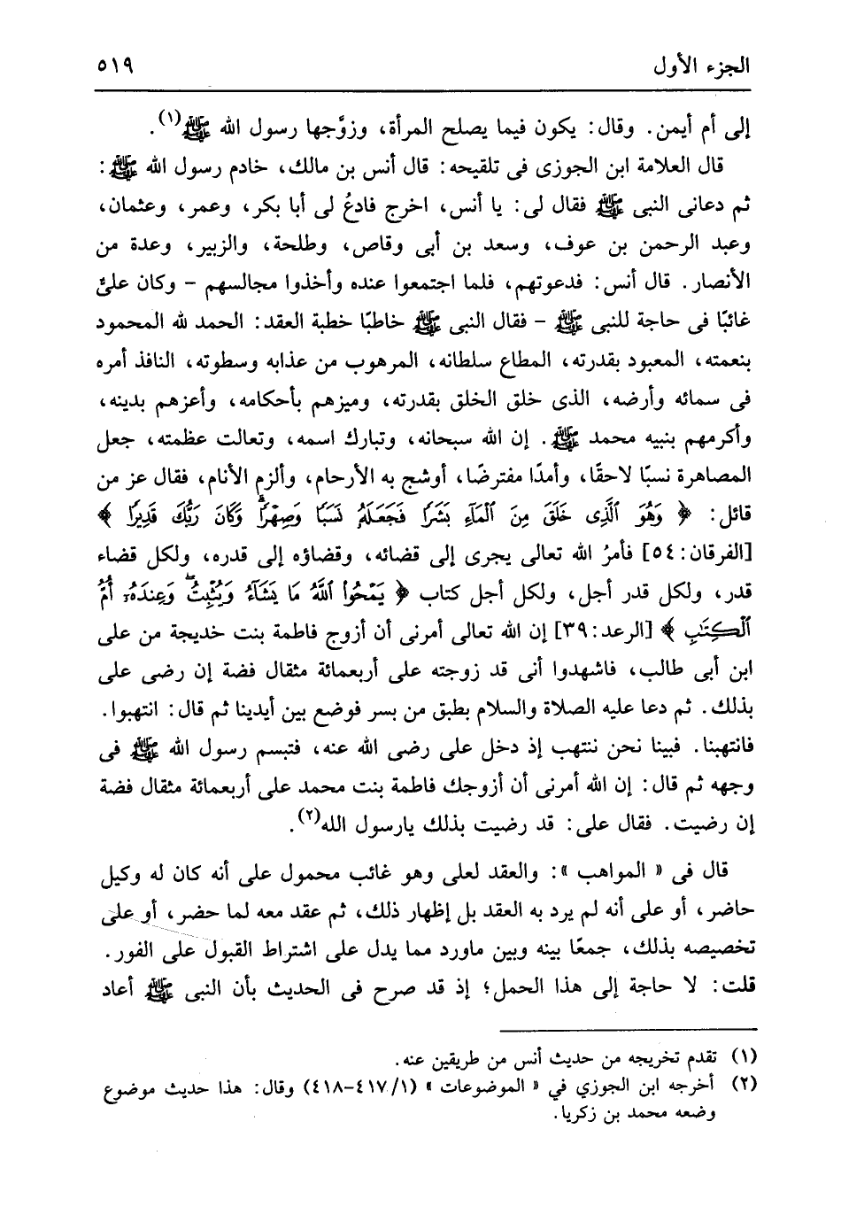إِن الله سُبْحَانَهُ وتبارك اسْمه وتعالت عَظمته جعل الْمُصَاهَرَة نسبا لَا حَقًا وأمداً مفترضاً أوشج بِهِ الْأَرْحَام وألزم الْأَنَام فَقَالَ عز من قَائِل {وَهُوَ الَّذِي خَلَقَ مِنَ الْمَاءِ بَشَراً فَجَعَلَهُ نَسَباً وَصِهْراً وَكَانَ رَبُّكَ قَدِيراً} الْفرْقَان 54 فَأمر الله تَعَالَى يجْرِي إِلَى قَضَائِهِ وقضاؤه إِلَى قدره وَلكُل قَضَاء قدر وَلكُل قدر أجل وَلكُل أجل كتاب {يَمْحُواْ اللَّهُ مَا يَشَاءُ وَيُثّبِتُ وَعِندَهُ أُمُّ الْكتاب} الرَّعْد 39 إِن الله تَعَالَى أَمرنِي أَن أزوج فَاطِمَة بنت خَدِيجَة من عَليّ ابْن أبي طَالب فَاشْهَدُوا أَنِّي قد زَوجته على أَرْبَعمِائَة مِثْقَال فضَّة إِن رَضِي عَليّ بذلك ثمَّ دَعَا عَلَيْهِ الصَّلَاة وَالسَّلَام بطبق من بسر فَوضع بَين ايدينا ثمَّ قَالَ انتبهوا فانتبهنا فَبينا نَحن ننتهب إِذْ دخل عَليّ رَضِي الله عَنهُ فَتَبَسَّمَ رَسُول الله
