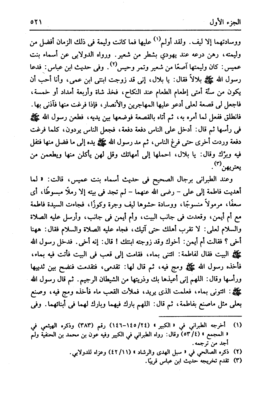 ووسادتهما إِلَّا لِيف وَلَقَد أولم عَلَيْهَا فَمَا كَانَت وَلِيمَة فِي ذَلِك الزَّمَان أفضل من وليمته رهن درعه عِنْد يَهُودِيّ بِشَطْر من شعير وَرَوَاهُ الدولابي عَن أَسمَاء بنت عُمَيْس كَانَ وليمتها آصعاً من شعير وتمر وحيس وَفِي حَدِيث ابْن عَبَّاس فَدَعَا رَسُول الله