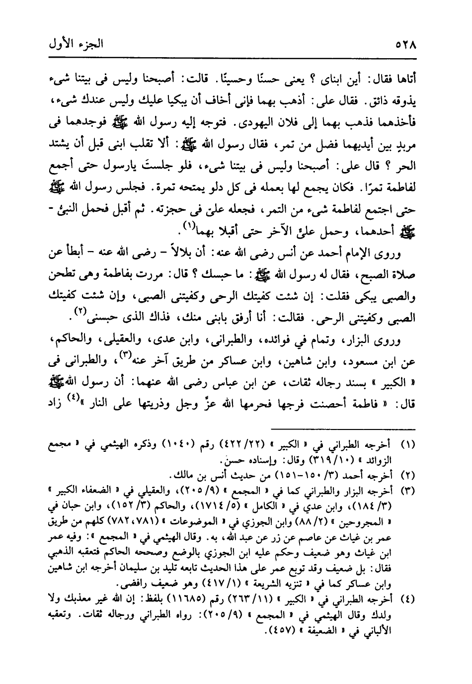 اتاهما فَقَالَ أَيْن ابناي يَعْنِي حسنا وَحسَيْنا قَالَت أصحبنا وَلَيْسَ فِي بيتنا شَيْء يذوقه ذائق فَقَالَ عَليّ أذهب بهما فَإِنِّي أَخَاف أَن يبكيا عَلَيْك وَلَيْسَ عنْدك شَيْء فَأَخذهُمَا فَذهب بهما إِلَى فلَان الْيَهُودِيّ فَتوجه إِلَيْهِ رَسُول الله