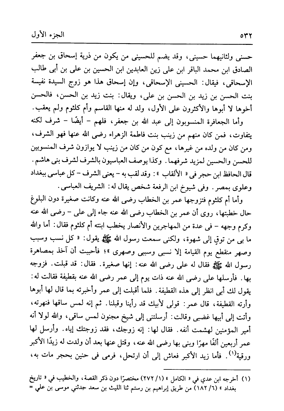 حسني ولثانيهما حسيني وَقد يضم للحسيني من يكون من ذُرِّيَّة إِسْحَاق بن جَعْفَر الصَّادِق ابْن مُحَمَّد الباقر ابْن عَليّ زين العابدين ابْن الْحُسَيْن بن عَليّ بن أبي طَالب الإسحاقي فَيُقَال الْحُسَيْنِي الإسحاقي وَإِن إِسْحَاق هَذَا هُوَ زوج السيدة نفيسة بنت الْحسن بن زيد بن الْحسن بن عَليّ وَيُقَال بنت زيد بن الْحسن فالحسن أَخُوهَا لَا أَبوهَا وَالْأَكْثَرُونَ على الأول ولد لَهُ مِنْهَا الْقَاسِم وَأم كُلْثُوم وَلم يعقب وَأما الجعافرة المنسوبون إِلَى عبد الله بن جَعْفَر فَلهم أَيْضا شرف لكنه يتَفَاوَت فَمن كَانَ مِنْهُم من زَيْنَب بنت فَاطِمَة الزهراء رَضِي الله عَنْهَا فَهُوَ الشّرف وَمن كَانَ من وَلَده من غَيرهَا مَعَ كَون من كَانَ من زَيْنَب لَا يوازون شرف المنسوبين لِلْحسنِ وَالْحُسَيْن لمزيد شرفهما وَكَذَا يُوصف العباسيون بالشرف لشرف بني هَاشم قَالَ الْحَافِظ ابْن حجر فِي الألقاب وَقد لقب بِهِ يَعْنِي الشّرف كل عباسي بِبَغْدَاد وعلوي بِمصْر وَفِي شُيُوخ ابْن الرّفْعَة شخص يُقَال لَهُ الشريف العباسي وَأما أم كُلْثُوم فَتَزَوجهَا عمر بن الْخطاب رَضِي الله عَنهُ وَكَانَت صَغِيرَة دون الْبلُوغ حَال خطبتها روى أَن عمر بن الْخطاب رَضِي الله عَنهُ جَاءَ إِلَى عَليّ رَضِي الله عَنهُ وكرم وَجهه فِي عدَّة من الْمُهَاجِرين وَالْأَنْصَار يخْطب ابْنَته أم كُلْثُوم فَقَالَ أما وَالله مَا بِي من توق إِلَى شَهْوَة وَلَكِنِّي سَمِعت رَسُول الله