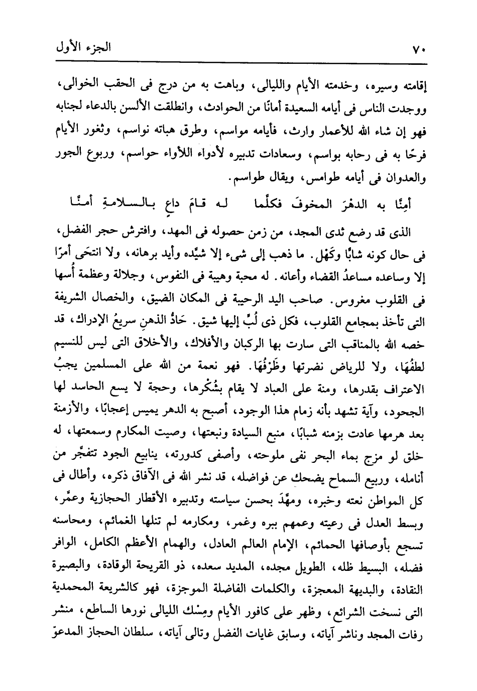 الَّذِي قد رضع ثدي الْمجد من زمن حُصُوله فِي المهد وافترش حجر الْفضل فِي حَال كَونه شَابًّا وكهل مَا ذهب إِلَى شَيْء إِلَّا شيده وأيد برهانه وَلَا انتحى أمرا إِلَّا وساعده مساعد الْقَضَاء وأعانه لَهُ محبَّة وهيبة فِي النُّفُوس وجلالة وعظمة أسها فِي الْقُلُوب مغروس صَاحب الْيَد الرحيبة فِي الْمَكَان الضّيق والخصال الشَّرِيفَة الَّتِي تَأْخُذ بِمَجَامِع الْقُلُوب فَكل ذِي لب إِلَيْهَا شيق حاد الذِّهْن سريع الْإِدْرَاك قد خصّه الله بالمناقب الَّتِي سَارَتْ بهَا الركْبَان والأفلاك والأخلاق الَّتِي لَيْسَ للنسيم لطفها وَلَا للرياض نضرتها وظرفها فَهُوَ نعْمَة من الله على الْمُسلمين يجب الِاعْتِرَاف بِقَدرِهَا ومنة على الْعباد لَا يُقَام بشكرها وَحجَّة لَا يسع الْحَاسِد لَهَا الْجُحُود وَآيَة تشهد بِأَنَّهُ زِمَام هَذَا الْوُجُود أصبح بِهِ الدَّهْر يميس إعجابا والأزمنة بعد هرمها عَادَتْ بزمنه شبَابًا منبع السِّيَادَة ونبعتها وصيت المكارم وَسمعتهَا لَهُ خلق لَو مزج بِمَاء الْبَحْر نفى ملوحته وأصفى كدورته ينابيع الْجُود تتفجر من أنامله وربيع السماح يضْحك عَن فواضله قد نشر الله فِي الْآفَاق ذكره وَأطَال فِي كل المواطن نَعته وَخَبره ومهد بِحسن سياسته وتدبيره الأقطار الحجازية وَعمر وَبسط الْعدْل فِي رَعيته وعمهم ببره وغمر ومكارمه لم تنلها الغمائم ومحاسنه تسجع بأوصافها الحمائم الإِمَام الْعَالم الْعَادِل والهمام الْأَعْظَم الْكَامِل الوافر فَضله الْبسط ظله الطَّوِيل مجده المديد سعده ذُو القريحة الوقادة والبصيرة النقادة والبديهة المعجزة والكلمات الفاضلة الموجزة فَهُوَ كالشريعة المحمدية الَّتِي نسخت الشَّرَائِع وَظهر على كافور الْأَيَّام ومسك اللَّيَالِي نورها الساطع منشر رفات الْمجد وناشر آيَاته وسابق غايات الْفضل وتالي آيَاته سُلْطَان الْحجاز الْمَدْعُو