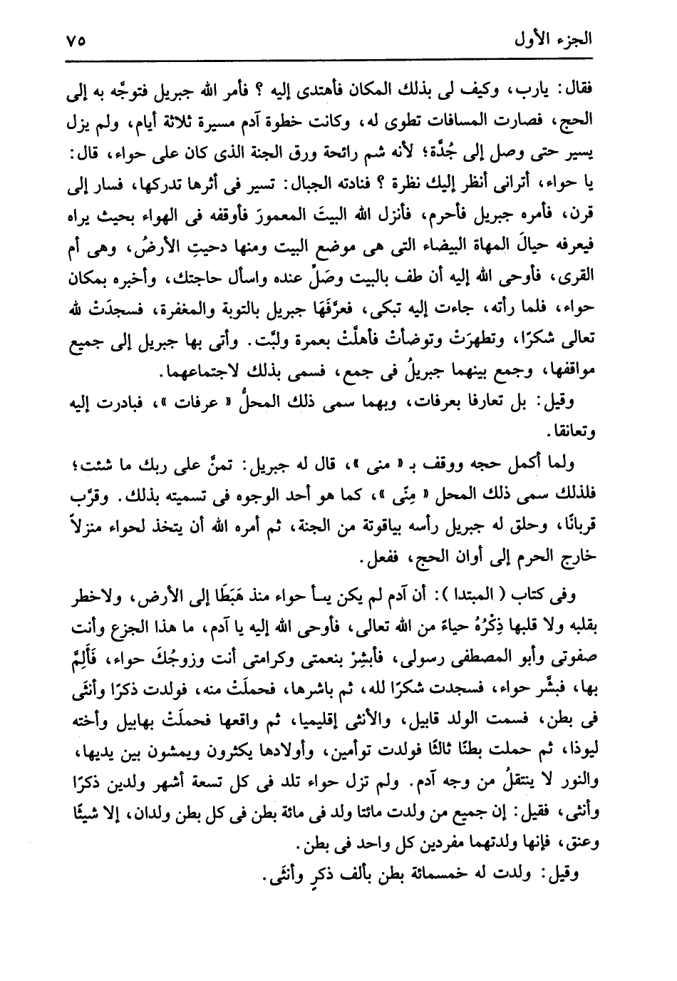 فَقَالَ يَا رب وَكَيف لي بذلك الْمَكَان فأهتدى إِلَيْهِ فَأمر الله جِبْرِيل فَتوجه بِهِ إِلَى الْحَج فَصَارَت المسافات تطوى لَهُ وَكَانَت خطْوَة آدم مسيرَة ثَلَاثَة أَيَّام وَلم يزل يسير حَتَّى وصل إِلَى جدة لِأَنَّهُ شم رَائِحَة ورق الْجنَّة الَّذِي كَانَ على حَوَّاء قَالَ يَا حَوَّاء أَترَانِي أنظر إِلَيْك نظرة فنادته الْجبَال تسير فِي أَثَرهَا تدركها فَسَار إِلَى قرن فَأمره جِبْرِيل فَأحْرم فَأنْزل الله الْبَيْت الْمَعْمُور فاوقفه فِي الْهَوَاء بِحَيْثُ يرَاهُ فيعرفه حِيَال المهاة الْبَيْضَاء الَّتِي هِيَ مَوضِع الْبَيْت وَمِنْهَا دحيت الأَرْض وَهِي أم الْقرى فَأوحى الله إِلَيْهِ أَن طف بِالْبَيْتِ وصل عِنْده واسأل حَاجَتك وَأخْبرهُ بمَكَان حَوَّاء فَلَمَّا رَأَتْهُ جَاءَت إِلَيْهِ تبْكي فعرفها جِبْرِيل بِالتَّوْبَةِ وَالْمَغْفِرَة فسجدت لله تَعَالَى شكرا وتطهرت وتوضأت فأهلت بِعُمْرَة ولبت وأتى بهَا جِبْرِيل إِلَى جَمِيع مواقفها وَجمع بَينهمَا جِبْرِيل فِي جمع فَسمى بذلك لاجتماعهما وَقيل بل تعارفا بِعَرَفَات وَبِهِمَا سمى ذَلِك الْمحل عَرَفَات فبادرت إِلَيْهِ وتعانقا وَلما أكمل حجَّة ووقف بمنى قَالَ لَهُ جِبْرِيل تمن على رَبك مَا شِئْت فَلذَلِك سمى ذَلِك الْمحل منى كَمَا هُوَ أحد الْوُجُوه فِي تَسْمِيَته بذلك وَقرب قرباناً وَحلق لَهُ جِبْرِيل رَأسه بياقوتة من الْجنَّة ثمَّ أمره الله أَن يتَّخذ لحواء منزلا خَارج الْحرم إِلَى أَوَان الْحَج فَفعل وَفِي كتاب المبتدا أَن آدم لم يكن يأحواء مُنْذُ هبطا إِلَى الأَرْض وَلَا خطر بِقَلْبِه وَلَا قَلبهَا ذكره حَيَاء من الله تَعَالَى فَأوحى الله إِلَيْهِ يَا آدم مَا هَذَا الْجزع وَأَنت صفوتي وَأَبُو الْمُصْطَفى رَسُولي فأبشر بنعمتي وكرامتي أَنْت وزوجك حَوَّاء فألم بهَا فبشر حَوَّاء فسجدت شكر لله ثمَّ بَاشَرَهَا فَحملت مِنْهُ فَولدت ذكرا وَأُنْثَى فِي بطن فَسَمت الْوَلِيد قابيل وَالْأُنْثَى إقليميا ثمَّ وَاقعهَا فَحملت بهابيل وَأُخْته ليوذا ثمَّ حملت بَطنا ثَالِثا فَولدت توأمين وَأَوْلَادهَا يكثرون ويمشون بَين يَديهَا والنور لَا ينْتَقل من وَجه آدم وَلم تزل حَوَّاء تَلد فِي كل تِسْعَة أشهر وَلدين ذكرا وَأُنْثَى فَقيل إِن جَمِيع من ولدت مِائَتَا ولدا فِي مائَة بطن فِي كل بطن ولدان إِلَّا شيثا وعنق فانهما ولدتهما مفردتين كل وَاحِد فِي بطن وَقيل ولدت لَهُ خَمْسمِائَة بطن بِأَلف ذكر وَأُنْثَى