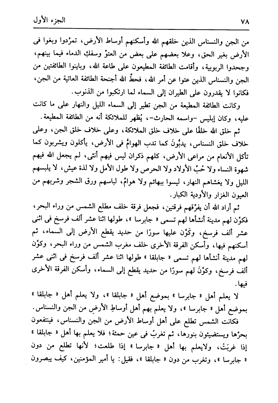 من الْجِنّ والنسناس الَّذين خلقهمْ الله وأسكنهم أوساط الأَرْض تمردوا وبغوا فِي الأَرْض بِغَيْر الْحق وَعلا بَعضهم على بعض من العتو وَسَفك الدِّمَاء فِيمَا بَينهم وجحدوا الربوبية وأقامت الطَّائِفَة المطيعون على طَاعَة الله وباينوا الطَّائِفَتَيْنِ من الْجِنّ والنسناس الَّذين عتوا عَن أَمر الله فحط الله أَجْنِحَة الطَّائِفَة العاتية من الْجِنّ فَكَانُوا لَا يقدرُونَ على الطيران إِلَى السَّمَاء لما ارتكبوا من الذُّنُوب وَكَانَت الطَّائِفَة المطيعة من الْجِنّ تطير إِلَى السَّمَاء اللَّيْل وَالنَّهَار على مَا كَانَت عَلَيْهِ وَكَانَ إِبْلِيس واسْمه الْحَارِث يظْهر للْمَلَائكَة أَنه من الطَّائِفَة المطيعة ثمَّ خلق الله خلقا على خلاف خلق الْمَلَائِكَة وعَلى خلاف خلق الْجِنّ وعَلى خلاف خلق النسناس يدبون كَمَا تدب الْهَوَام فِي الأَرْض يَأْكُلُون وَيَشْرَبُونَ كَمَا تَأْكُل الْأَنْعَام من مرَاعِي الأَرْض كلهم ذكران لَيْسَ فيهم أُنْثَى لم يَجْعَل الله فيهم شَهْوَة النِّسَاء وَلَا حب الْأَوْلَاد وَلَا الْحِرْص وَلَا طول الأمل وَلَا لَذَّة عَيْش لَا يلْبِسهُمْ اللَّيْل وَلَا يَغْشَاهُم النَّهَار لَيْسُوا ببهائهم وَلَا هوَام لباسهم ورق الشّجر وشربهم من الْعُيُون الغزار والأودية الْكِبَار ثمَّ أَرَادَ الله أَن يُفَرِّقهُمْ فرْقَتَيْن فَجعل فرقة خلف مطلع الشَّمْس من وَرَاء الْبَحْر فكون لَهُم مَدِينَة أَنْشَأَهَا لَهُم تسمى جابرسا طولهَا اثْنَا عشر ألف فَرسَخ فِي اثْنَي عشر ألف فَرسَخ وَكَون عَلَيْهَا سوراً من حَدِيد يقطع الأَرْض إِلَى السَّمَاء ثمَّ أسكنهم فِيهَا وأسكن الْفرْقَة الْأُخْرَى خلف مغرب الشَّمْس من وَرَاء الْبَحْر وَكَون لَهُم مَدِينَة أَنْشَأَهَا لَهُم تسمى جابلقا طولهَا اثْنَا عشر ألف فَرسَخ فِي اثْنَي عشر ألف فَرسَخ وَكَون لَهُم سوراً من حَدِيد يقطع إِلَى السَّمَاء وأسكن الْفرْقَة الْأُخْرَى فِيهَا لَا يعلم أهل جابرسا بِموضع أهل جابلقا وَلَا يعلم أهل جابلقا بِموضع أهل جابرسا وَلَا يعلم بهَا أهل أوساط الأَرْض من الْجِنّ والنسناس فَكَانَت الشَّمْس تطلع على أهل أوساط الأَرْض من الْجِنّ والنسناس فينتفعون بحرها ويستضيئون بنورها ثمَّ تغرب فِي عين حمئة فَلَا يعلم بهَا أهل جابلقا إِذا غربت وَلَا يعلم بهَا أهل جابرسا إِذا طلعت لِأَنَّهَا تطلع من دون جابرسا وتغرب من دون جابلقا فَقيل يَا أَمِير الْمُؤمنِينَ كَيفَ يبصرون