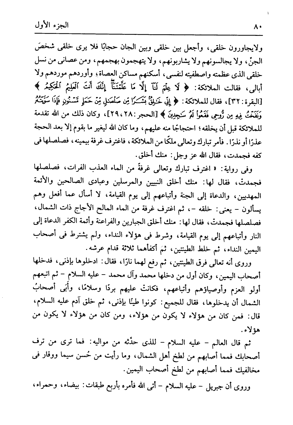 وَلَا يجاورون خلقي وَأَجْعَل بَين خلقي وَبَين الجان حِجَابا فَلَا يرى خلقي شخص الْجِنّ وَلَا يجالسونهم وَلَا يشاربونهم وَلَا يتهجمون بهمجهم وَمن عَصَانِي من نسل خلقي الَّذِي عَظمته واصطفيته لنَفْسي أسكنهم مسَاكِن العصاة وأوردهم موردهم وَلَا أُبَالِي فَقَالَت الْمَلَائِكَة {لاَ عِلْمَ لَنَا إِلاَّ مَا عَلَّمْتَنَا إِنَّكَ أَنَتَ الْعَلِيمُ الْحَكِيمُ} الْبَقَرَة 32 فَقَالَ للْمَلَائكَة إِنِّي خَالق بشرا من صلصال من حمأ مَّسْنُونٍ فَإِذَا سَوَّيْتُهُ وَنَفَخْتُ فِيهِ مِن رُّوحِي فقعوا لَهُ ساجدين} الْحجر 28 29 وَكَانَ ذَلِك من الله تقدمة للْمَلَائكَة قبل أَن يخلقه احتجاجاً مِنْهُ عَلَيْهِم وَمَا كَانَ الله ليغير مَا بِقوم إِلَّا بعد الْحجَّة عذرا أَو نذرا فَأمر تبَارك وَتَعَالَى ملكا من الْمَلَائِكَة فاغترف غرفَة بِيَمِينِهِ فصلصلها فِي كَفه فجمدت فَقَالَ الله عز وَجل مِنْك أخلق وَفِي رِوَايَة اغترف تبَارك وَتَعَالَى غرفَة من المَاء العذب الْفُرَات فصلصلها فجمدت فَقَالَ لَهَا مِنْك أخلق النَّبِيين وَالْمُرْسلِينَ وعبادي الصَّالِحين وَالْأَئِمَّة المهديين والدعاة إِلَى الْجنَّة وأتباعهم إِلَى يَوْم الْقِيَامَة لَا أسأَل عَمَّا أفعل وهم يسْأَلُون يَعْنِي خلقه ثمَّ اغترف غرفَة من المَاء المالح الأجاج ذَات الشمَال فصلصلها فجمدت فَقَالَ لَهَا مِنْك أخلق الجبارين والفراعنة وأئمة الْكفْر الدعاة إِلَى النَّار وأتباعهم إِلَى يَوْم الْقِيَامَة وَشرط فِي هَؤُلَاءِ النداء وَلم يشْتَرط فِي أَصْحَاب الْيَمين النداء ثمَّ خلط الطينتين ثمَّ أكفأهما ثَلَاثَة قُدَّام عَرْشه وروى أَنه تَعَالَى فرق الطينتين ثمَّ رفع لَهما نَارا فَقَالَ ادخلوها بإذني فَدَخلَهَا أَصْحَاب الْيَمين وَكَانَ أول من دَخلهَا مُحَمَّد وَآل مُحَمَّد عَلَيْهِ السَّلَام ثمَّ اتبعهم أولو الْعَزْم وأوصياؤهم وأتباعهم فَكَانَت عَلَيْهِم بردا وَسلَامًا وأبى أَصْحَاب الشمَال أَن يدخلوها فَقَالَ للْجَمِيع كونُوا طيناً بإذني ثمَّ خلق آدم عَلَيْهِ السَّلَام قَالَ فَمن كَانَ من هَؤُلَاءِ لَا يكون من هَؤُلَاءِ من كَانَ من هَؤُلَاءِ لَا يكون من هَؤُلَاءِ ثمَّ قَالَ الْعَالم عَلَيْهِ السَّلَام للَّذي حَدثهُ من موَالِيه فَمَا ترى من ترف أَصْحَابك فمما أَصَابَهُم من لطخ أهل الشمَال وَمَا رَأَيْت من حسن سِيمَا ووقار فِي مخالفيك فمما أَصَابَهُم من لطخ أَصْحَاب الْيَمين وروى أَن جِبْرِيل عَلَيْهِ السَّلَام أَتَى الله فَأمره بِأَرْبَع طَبَقَات بَيْضَاء وحمراء