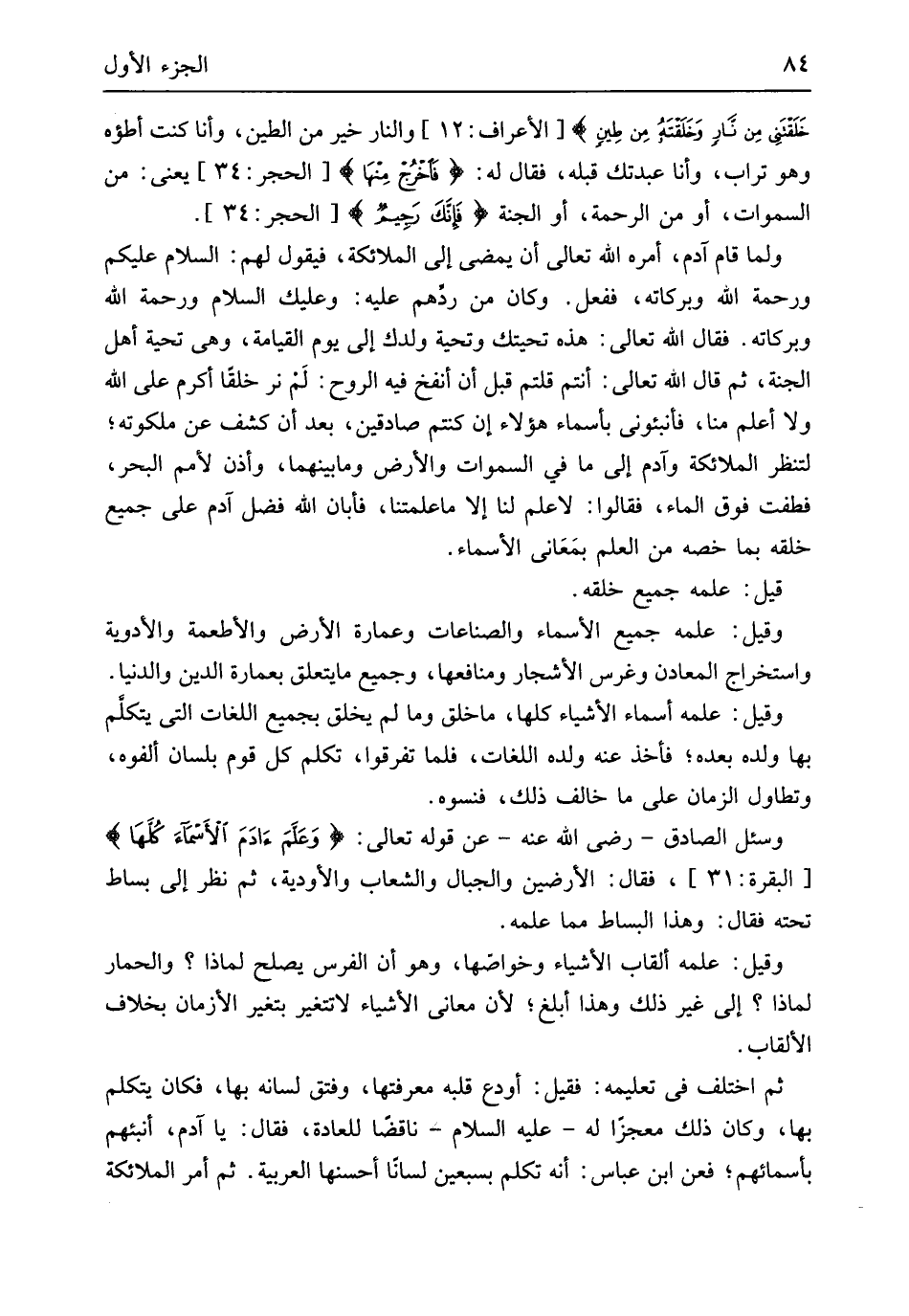 خَلَقْتَنِي مِن نَّارٍ وَخَلَقْتَهُ مِن طِينٍ} الْأَعْرَاف 12 وَالنَّار خير من الطين وَأَنا كنت أطؤه وَهُوَ تُرَاب وَأَنا عبدتك قبله فَقَالَ لَهُ {فَاخْرُجْ مِنْهَا} الْحجر 34 يَعْنِي من السَّمَوَات أَو من الرَّحْمَة أَو الْجنَّة {فَإِنَّكَ رَجِيمٌ} الْحجر 34 وَلما قَامَ آدم أمره الله تَعَالَى أَن يمْضِي إِلَى الْمَلَائِكَة فَيَقُول لَهُم السَّلَام عَلَيْكُم وَرَحْمَة الله وَبَرَكَاته فَفعل وَكَانَ من ردهم عَلَيْهِ وَعَلَيْك السَّلَام وَرَحْمَة الله وَبَرَكَاته فَقَالَ الله تَعَالَى هَذِه تحيتك وتحية ولدك إِلَى يَوْم الْقِيَامَة وَهِي تَحِيَّة أهل الْجنَّة ثمَّ قَالَ الله تَعَالَى أَنْتُم قُلْتُمْ قبل أَن انفخ فِيهِ الرّوح لم نر خلقا اكر على الله وَلَا أعلم منا فأنبئوني بأسماء هَؤُلَاءِ إِن كُنْتُم صَادِقين بعد أَن كشف عَن ملكوته لتنظر الْمَلَائِكَة وآدَم إِلَى مَا فِي السَّمَوَات وَالْأَرْض وَمَا بَينهمَا وَأذن لأمم الْبَحْر فطفت فَوق المَاء فَقَالُوا لَا علم لنا إِلَّا مَا علمتنا فأبان الله فضل آدم على جَمِيع خلقه بِمَا خصّه من الْعلم بمعاني الْأَسْمَاء قيل علمه جَمِيع خلقه وَقيل علمه جَمِيع الْأَسْمَاء والصناعات وَعمارَة الأَرْض والأطعمة والأدوية واستخراج الْمَعَادِن وغرس الْأَشْجَار ومنافعها وَجَمِيع مَا يتَعَلَّق بعمارة الدّين وَالدُّنْيَا وَقيل علمه أَسمَاء الْأَشْيَاء كلهَا مَا خلق وَمَا لم يخلق بِجَمِيعِ اللُّغَات الَّتِي يتَكَلَّم بهَا وَلَده بعده فَأخذ عَنهُ وَلَده اللُّغَات فَلَمَّا تفَرقُوا تكلم كل قوم بِلِسَان ألفوه وتطاول الزَّمَان على مَا خَالف ذَلِك فنسوه وَسُئِلَ الصَّادِق رَضِي الله تَعَالَى عَنهُ عَن قَوْله تَعَالَى {وَعلم آدم الأَسْمَاءَ كُلَّهَا} الْبَقَرَة 31 فَقَالَ الْأَرْضين وَالْجِبَال والشعاب والأودية ثمَّ نظر إِلَى بِسَاط تَحْتَهُ فَقَالَ وَهَذَا الْبسَاط مِمَّا علمه وَقيل علمه ألقاب الْأَشْيَاء وخواصها وَهُوَ أَن الْفرس يصلح لماذا وَالْحمار لماذا إِلَى غير ذَلِك وَهَذَا أبلغ لِأَن مَعَاني الْأَشْيَاء لَا تَتَغَيَّر بِتَغَيُّر الْأَزْمَان بِخِلَاف الألقاب ثمَّ اخْتلف فِي تَعْلِيمه فَقيل أودع قلبه مَعْرفَتهَا وفتق لِسَانه بهَا فَكَانَ يتَكَلَّم بهَا وَكَانَ ذَلِك معجزاً لَهُ عَلَيْهِ السَّلَام ناقضاً للْعَادَة فَقَالَ يَا آدم أنبئهم بِأَسْمَائِهِمْ فَعَن ابْن عَبَّاس أَنه تكلم بسبعين لِسَانا أحْسنهَا الْعَرَبيَّة ثمَّ أَمر الْمَلَائِكَة