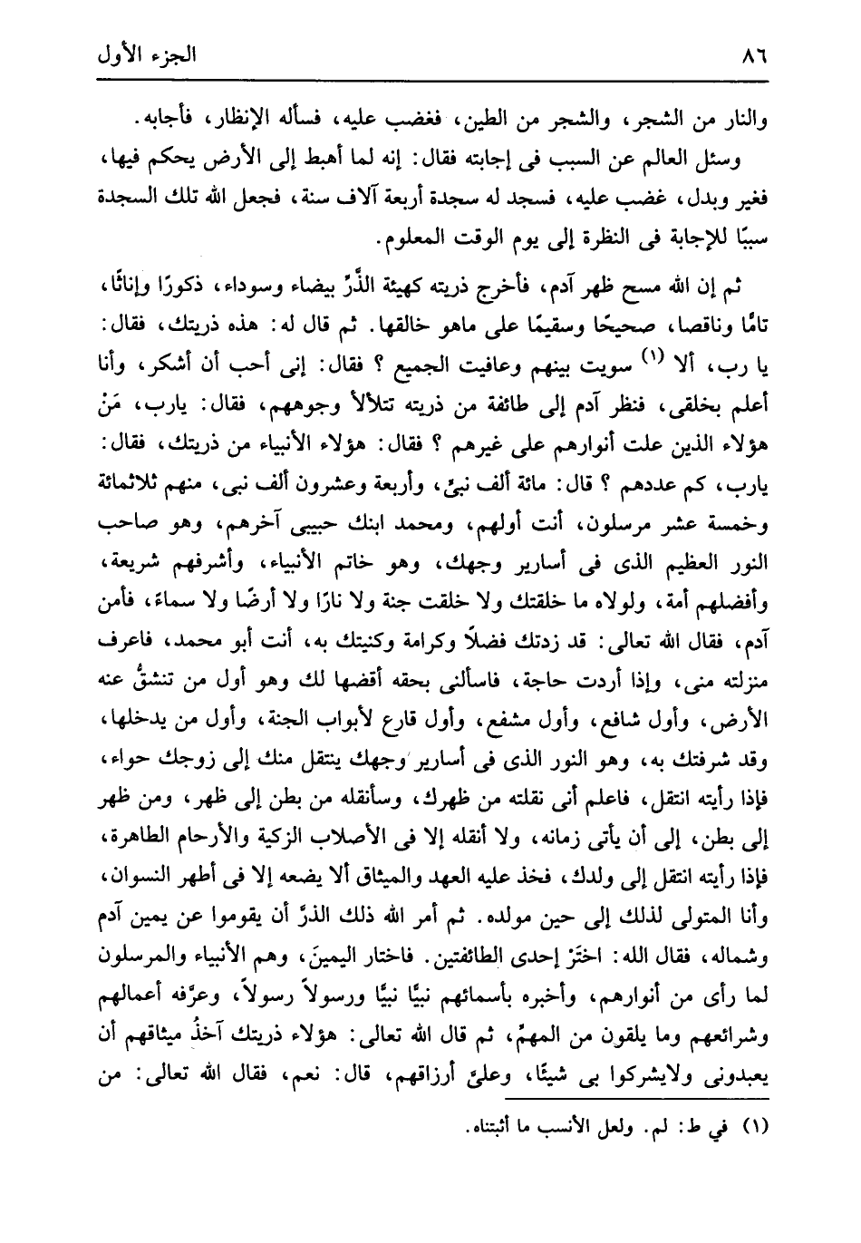 وَالنَّار من الشّجر وَالشَّجر من الطين فَغَضب عَلَيْهِ فَسَأَلَهُ الِانْتِظَار فَأَجَابَهُ وَسُئِلَ الْعَالم عَن السَّبَب فِي إجَابَته فَقَالَ إِنَّه لما أهبط إِلَى الأَرْض يحكم فِيهَا فَغير وَبدل غضب عَلَيْهِ فَسجدَ لَهُ سَجْدَة أَرْبَعَة آلَاف سنة فَجعل الله تِلْكَ السَّجْدَة سَببا للإجابة فِي النظرة إِلَى يَوْم الْوَقْت الْمَعْلُوم ثمَّ إِن الله مسح ظهر آدم فَأخْرج ذُريَّته كَهَيئَةِ الذَّر بَيْضَاء وسوداء ذُكُورا وإناثاً تَاما وناقصاً صَحِيحا وسقيماً على مَا هُوَ خَالِقهَا ثمَّ قَالَ لَهُ هَذِه ذريتك فَقَالَ يَا رب أَلا سويت بَينهم وعافيت الْجَمِيع فَقَالَ إِنِّي أحب أَن أشكر وَأَنا أعلم بخلقي فَنظر آدم إِلَى طَائِفَة من ذُريَّته تتلألأ وُجُوههم فَقَالَ يَا رب من هَؤُلَاءِ الَّذين علت أنوارهم على غَيرهم فَقَالَ هَؤُلَاءِ الْأَنْبِيَاء من ذريتك فَقَالَ يَا رب كم عَددهمْ قَالَ مائَة ألف نَبِي وَأَرْبَعَة وَعِشْرُونَ ألف نَبِي مِنْهُم ثَلَاثمِائَة وَخَمْسَة عشر مرسلون أَنْت أَوَّلهمْ وَمُحَمّد ابْنك حَبِيبِي آخِرهم وَهُوَ صَاحب النُّور الْعَظِيم الَّذِي فِي أسارير وَجهك وَهُوَ خَاتم الْأَنْبِيَاء وأشرفهم شَرِيعَة وأفضلهم أمة ولولاه مَا خلقتك وَلَا خلقت جنَّة وَلَا نَارا وَلَا أَرضًا وَلَا سَمَاء فأمن آدم فَقَالَ الله تَعَالَى قد زدتك فضلا وكرامة وكنيتك بِهِ أَنْت أَبُو مُحَمَّد فاعرف مَنْزِلَته مني وَإِذا أردْت حَاجَة فاسألني بِحقِّهِ أقضها لَك وَهُوَ أول من تَنْشَق عَنهُ الأَرْض وَأول شَافِع وَأول مُشَفع وَأول قارع لأبواب الْجنَّة وَأول من يدخلهَا وَقد شرفتك بِهِ وَهُوَ النُّور الَّذِي فِي أسارير وَجهك ينْتَقل مِنْك إِلَى زَوجك حَوَّاء فَإِذا رَأَيْته انْتقل فَاعْلَم أَنِّي نقلته من ظهرك إِلَى وسأنقله من بطن إِلَى ظهر وَمن ظهر إِلَى بطن إِلَى أَن يَأْتِي زَمَانه وَلَا أنقله إِلَّا فِي الأصلاب الزكية والأرحام الطاهرة فَإِذا رَأَيْته انْتقل إِلَى ولدك فَخذ عَلَيْهِ الْعَهْد والميثاق أَلا يَضَعهُ إِلَّا فِي أطهر النسوان وَأَنا الْمُتَوَلِي لذَلِك إِلَى حِين مولده ثمَّ أَمر الله ذَلِك الذَّر أَن يقومُوا عَن يَمِين آدم وشماله فَقَالَ الله اختر إِحْدَى الطَّائِفَتَيْنِ فَاخْتَارَ الْيَمين وهم الْأَنْبِيَاء والمرسلون لما رأى من أنوارهم وَأخْبرهُ بِأَسْمَائِهِمْ نَبيا نَبيا ورسولاً رَسُولا وعرفه أَعْمَالهم وشرائعهم وَمَا يلقون من المهم ثمَّ قَالَ الله تَعَالَى هَؤُلَاءِ ذريتك آخذ ميثاقهم أَن يعبدوني وَلَا يشركوا بِي شَيْئا وَعلي أَرْزَاقهم قَالَ نعم فَقَالَ الله تَعَالَى من