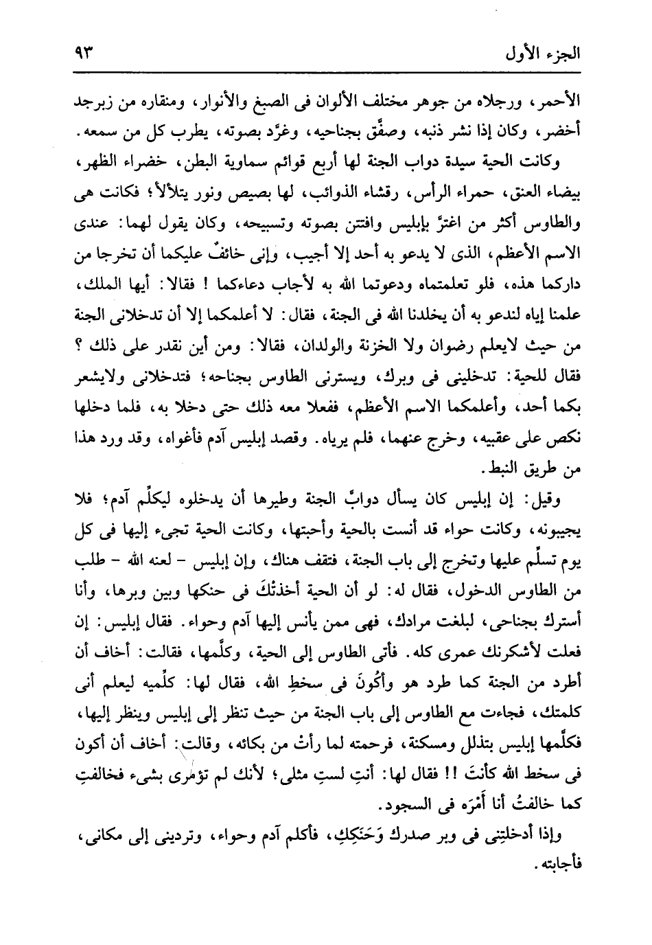 الْأَحْمَر وَرجلَاهُ من جَوْهَر مُخْتَلف الألوان فِي الصَّبْغ والأنوار ومنقاره من زبرجد أَخْضَر وَكَانَ إِذا نشر ذَنبه وصفق بجناحيه وغرد بِصَوْتِهِ يطرب كل من سَمعه وَكَانَت الْحَيَّة سيدة دَوَاب الْجنَّة لَهَا أَربع قَوَائِم سَمَاوِيَّة الْبَطن خضراء الظّهْر بَيْضَاء الْعُنُق حَمْرَاء الرَّأْس رقشاء الذوائب لَهَا بصيص وَنور يتلألأ فَكَانَت هِيَ والطاوس أَكثر من اغْترَّ بإبليس وافتتن بِصَوْتِهِ وتسبيحه وَكَانَ يَقُول لَهما عِنْدِي الِاسْم الْأَعْظَم الَّذِي لَا يَدعُوهُ بِهِ أحد إِلَّا أُجِيب وَإِنِّي خَائِف عَلَيْكُمَا أَن تخرجا من داركما هَذِه فَلَو تعلمتماه ودعوتما الله بِهِ لأجاب دعاءكما فَقَالَا أَيهَا الْملك علمنَا إِيَّاه لندعو بِهِ أَن يخلدنا الله فِي الْجنَّة فَقَالَ لَا أعلمكما إِلَّا أَن تدخلاني الْجنَّة من حَيْثُ لَا يعلم رضوَان وَلَا الخزنة والولدان فَقَالَا وَمن أَيْن نقدر على ذَلِك فَقَالَ للحية تدخليني فِي وبرك ويسترني الطاوس بجناحه فتدخلاني وَلَا يشْعر بكما أحد وأعلمكما الِاسْم الْأَعْظَم ففعلا مَعَه ذَلِك حَتَّى دخلا بِهِ فَلَمَّا دَخلهَا نكص على عَقِبَيْهِ وَخرج عَنْهُمَا فَلم يرياه وَقصد إِبْلِيس آدم فأغواه وَقد ورد هَذَا من طَرِيق النبط وَقيل إِن إِبْلِيس كَانَ يسْأَل دَوَاب الْجنَّة وطيرها أَن يدخلوه ليكلم آدم فَلَا يجيبونه وَكَانَت حَوَّاء قد أنست بالحية وأحبتها وَكَانَت الْحَيَّة تجىء إِلَيْهَا فِي كل يَوْم تسلم عَلَيْهَا وَتخرج إِلَى بَاب الْجنَّة فتقف هُنَاكَ وَإِن إِبْلِيس لَعنه الله طلب من الطاوس الدُّخُول فَقَالَ لَهُ لَو أَن الْحَيَّة أخذتك فِي حنكها وَبَين وبرها وَأَنا أسترك بجناحي لبلغت مرادك فَهِيَ مِمَّن يأنس إِلَيْهَا آدم وحواء فَقَالَ إِبْلِيس إِن فعلت لأشكرنك عمري كُله فَأتى الطاوس إِلَى الْحَيَّة وكلمها فَقَالَت أَخَاف أَن أطْرد من الْجنَّة كَمَا طرد هُوَ وأكون فِي سخط الله فَقَالَ لَهَا كلميه ليعلم أَنِّي كلمتك فَجَاءَت مَعَ الطاوس إِلَى بَاب الْجنَّة من حَيْثُ تنظر إِلَى إِبْلِيس وَينظر إِلَيْهَا فكلمها إِبْلِيس بتذلل ومسكنة فرحمته لما رَأَتْ من بكائه وَقَالَت أَخَاف أَن أكون فِي سخط الله كَأَنْت فَقَالَ لَهَا أَنْت لست مثلي لِأَنَّك لم تؤمري بِشَيْء فخالفت كَمَا خَالَفت أَنا أمره فِي السُّجُود وَإِذا أدخلتني فِي وبر صدرك وحنكك فأكلم آدم وحواء وترديني إِلَى مَكَاني فأجابته