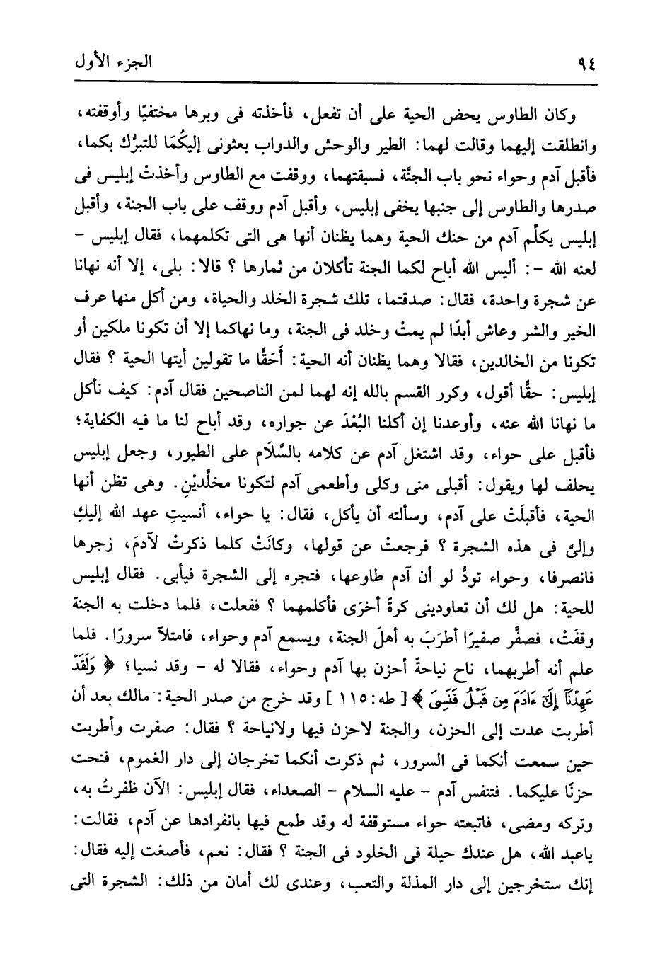 وَكَانَ الطاوس يحض الْحَيَّة على أَن تفعل فَأَخَذته فِي وبرها مختفياً وأوقفته وَانْطَلَقت إِلَيْهِمَا وَقَالَت لَهما الطير والوحش وَالدَّوَاب بعثوني إلَيْكُمَا للتبرك بكما فَأقبل آدم وحواء نَحْو بَاب الْجنَّة فسبقتهما ووقفت مَعَ الطاوس وَأخذت إِبْلِيس فِي صَدره والطاوس إِلَى جنبها يخفي إِبْلِيس وَأَقْبل آدم ووقف على بَاب الْجنَّة وَأَقْبل إِبْلِيس يكلم آدم من حنك الْحَيَّة وهما يظنان أَنَّهَا هِيَ الَّتِي تكلمها فَقَالَ إِبْلِيس لَعنه الله أَلَيْسَ الله أَبَاحَ لَكمَا الْجنَّة تأكلان من ثمارها قَالَا بلَى إِلَّا أَنه قد نَهَانَا عَن شَجَرَة وَاحِدَة فَقَالَ صدقتما تِلْكَ شَجَرَة الْخلد والحياة وَمن أكل مِنْهَا عرف الْخَيْر وَالشَّر وعاش أبدا لم يمت وخلد فِي الْجنَّة وَمَا نهاكما إِلَّا أَن تَكُونَا ملكَيْنِ أَو تَكُونَا من الخالدين فَقَالَا وهما يظنان أَنه الْحَيَّة أحقاً مَا تَقُولِينَ أيتها الْحَيَّة فَقَالَ إِبْلِيس حَقًا أَقُول وَكرر الْقسم بِاللَّه إِنَّه لَهما لمن الناصحين فَقَالَ آدم كَيفَ نَأْكُل مَا نَهَانَا الله عَنهُ وأوعدنا إِن أكلنَا الْبعد عَن جواره وَقد أَبَاحَ لنا مَا فِيهِ الْكِفَايَة فَأقبل على حَوَّاء وَقد اشْتغل آدم عَن كَلَامه بِالسَّلَامِ على الطُّيُور وَجعل إِبْلِيس يحلف لَهَا وَيَقُول أقبلي مني وكلي وأطعمي آدم لتكونا مخلدين وَهِي تظن أَنَّهَا الْحَيَّة فَأَقْبَلت على آدم وَسَأَلته أَن يَأْكُل فَقَالَ يَا حَوَّاء أنسيت عهد الله إِلَيْك وإلي فِي هَذِه الشَّجَرَة فَرَجَعت عَن قَوْلهَا وَكَانَت كلما ذكرت لآدَم زجرها فانصرفا وحواء تود لَو أَن آدم طاوعها فتجره إِلَى الشَّجَرَة فيأبى فَقَالَ إِبْلِيس للحية هَل لَك أَن تعاوديني كرة أُخْرَى فأكلمهما فَفعلت فَلَمَّا دخلت بِهِ الْجنَّة وقفت فصفر صفيراً أطرب بِهِ أهل الْجنَّة وَيسمع آدم وحواء فامتلآ سُرُورًا فَلَمَّا علم أَنه أطربهما ناح نياحةً أَحْزَن بهَا آدم وحواء فَقَالَا لَهُ وَقد نسيا {وَلَقَد عهدنا إِلَى آدم مِن قَبْلُ فَنَسِيَ} طه 115 وَقد خرج من صدر الْحَيَّة مَالك بعد إِن أطربت عهِدت إِلَى الْحزن وَالْجنَّة لَا حزن فِيهَا وَلَا نياحة فَقَالَ صفرت وأطربت حِين سَمِعت أنكما فِي سرُور ثمَّ ذكرت أنكما تخرجان إِلَى دَار الغموم فنحت حزنا عَلَيْكُمَا فتنفس آدم عَلَيْهِ السَّلَام الصعداء فَقَالَ إِبْلِيس الْآن ظَفرت بِهِ وَتَركه وَمضى فاتبعته حَوَّاء مستوقفة لَهُ وَقد طمع فِيهَا بانفرادها عَن آدم فَقَالَت يَا عبد الله هَل عنْدك حِيلَة فِي الخلود فِي الْجنَّة فَقَالَ نعم فأصغت إِلَيْهِ فَقَالَ إِنَّك ستخرجين إِلَى دَار المذلة والتعب وَعِنْدِي لَك أَمَان من ذَلِك الشَّجَرَة الَّتِي