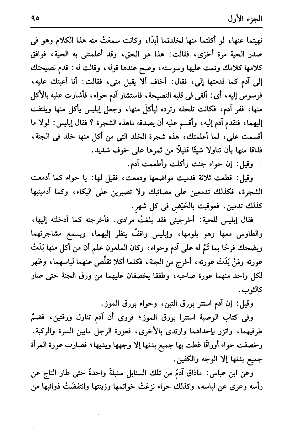 نهيتما عَنْهَا لَو أكلتما مِنْهَا لخلدتما أبدا وَكَانَت سَمِعت مِنْهُ هَذَا الْكَلَام وَهُوَ فِي صدر الْحَيَّة مرّة أُخْرَى فَقَالَت هَذَا هُوَ الْحق وَقد أعلمتني بِهِ الْحَيَّة فَوَافَقَ كَلَامهَا كلامك وتمت عَلَيْهَا وسوسته وَصَحَّ عِنْدهَا قَوْله وَقَالَت لَهُ قدم نصيحتك إِلَى آدم كَمَا قدمتها إِلَيّ فَقَالَ أَخَاف أَلا يقبل مني فَقَالَت أَنا أعينك عَلَيْهِ فوسوس إِلَيْهِ أَي ألْقى فِي قلبه النَّصِيحَة فَاسْتَشَارَ آدم حَوَّاء فَأَشَارَتْ عَلَيْهِ بِالْأَكْلِ مِنْهَا ففر آدم فَكَانَت تلْحقهُ وترده ليَأْكُل مِنْهَا وَجعل إِبْلِيس يَأْكُل مِنْهَا ويلتفت إِلَيْهِمَا فَتقدم آدم إِلَيْهِ وَأقسم عَلَيْهِ أَن يصدقهُ مَا هَذِه الشَّجَرَة فَقَالَ إِبْلِيس لَوْلَا مَا أَقْسَمت عَليّ لما أعلمتك هَذِه شَجَرَة الْخلد الَّتِي من أكل مِنْهَا خلد فِي الْجنَّة فذاقا مِنْهَا بِأَن تناولا شَيْئا قَلِيلا من ثَمَرهَا على خوف شَدِيد وَقيل إِن حَوَّاء جنت وأكلت وأطعمت آدم وَقيل قطعت ثَلَاثَة فدميت موَاضعهَا ودمعت فَقيل لَهَا يَا حَوَّاء كَمَا أدمعت الشَّجَرَة فَكَذَلِك تدمعين على مصائبك وَلَا تصبرين على الْبكاء وكما آدميتها كَذَلِك تدمين فعوقبت بِالْحيضِ فِي كل شهر فَقَالَ إِبْلِيس للحية أخرجيني فقد بلغت مرادي فَأَخْرَجته كَمَا أدخلته إِلَيْهَا والطاوس مَعهَا وَهُوَ يلومها وإبليس وَاقِف ينظر إِلَيْهِمَا وَيسمع مشاجرتهما ويضحك فَرحا بِمَا تمّ لَهُ على آدم وحواء وَكَانَ الملعون علم أَن من أكل مِنْهَا بَدَت عَوْرَته وَمن بَدَت عَوْرَته أخرج من الْجنَّة فَكلما أكلا تقلص عَنْهُمَا لباسهما وَظهر لكه وَاحِد مِنْهُمَا عَورَة صَاحبه وطفقا يخصفان عَلَيْهِمَا من ورق الْجنَّة حَتَّى صَار كَالثَّوْبِ وَقيل إِن آدم استتر بورق التِّين وحواء بورق الموز وَفِي كتاب الْوَصِيَّة استترا بورق الموز فروى أَن آدم تنَاول ورقتين فضم طرفيهما واتزر بِإِحْدَاهُمَا وارتدى بِالْأُخْرَى فعورة الرجل مَا بَين السُّرَّة وَالركبَة وخصفت حَوَّاء أوراقاً غطت بهَا جَمِيع بدنهَا إِلَّا وَجههَا ويديها فَصَارَت عَورَة الْمَرْأَة جَمِيع بدنهَا إِلَّا الْوَجْه وَالْكَفَّيْنِ وَعَن ابْن عَبَّاس مَا ذاق آدم من تِلْكَ السنابل سنبلةً وَاحِدَة حَتَّى طَار التَّاج عَن رَأسه وعرى عَن لِبَاسه وَكَذَلِكَ حَوَّاء نزعت خواتمها وَزينتهَا وانتقضت ذوائبها من