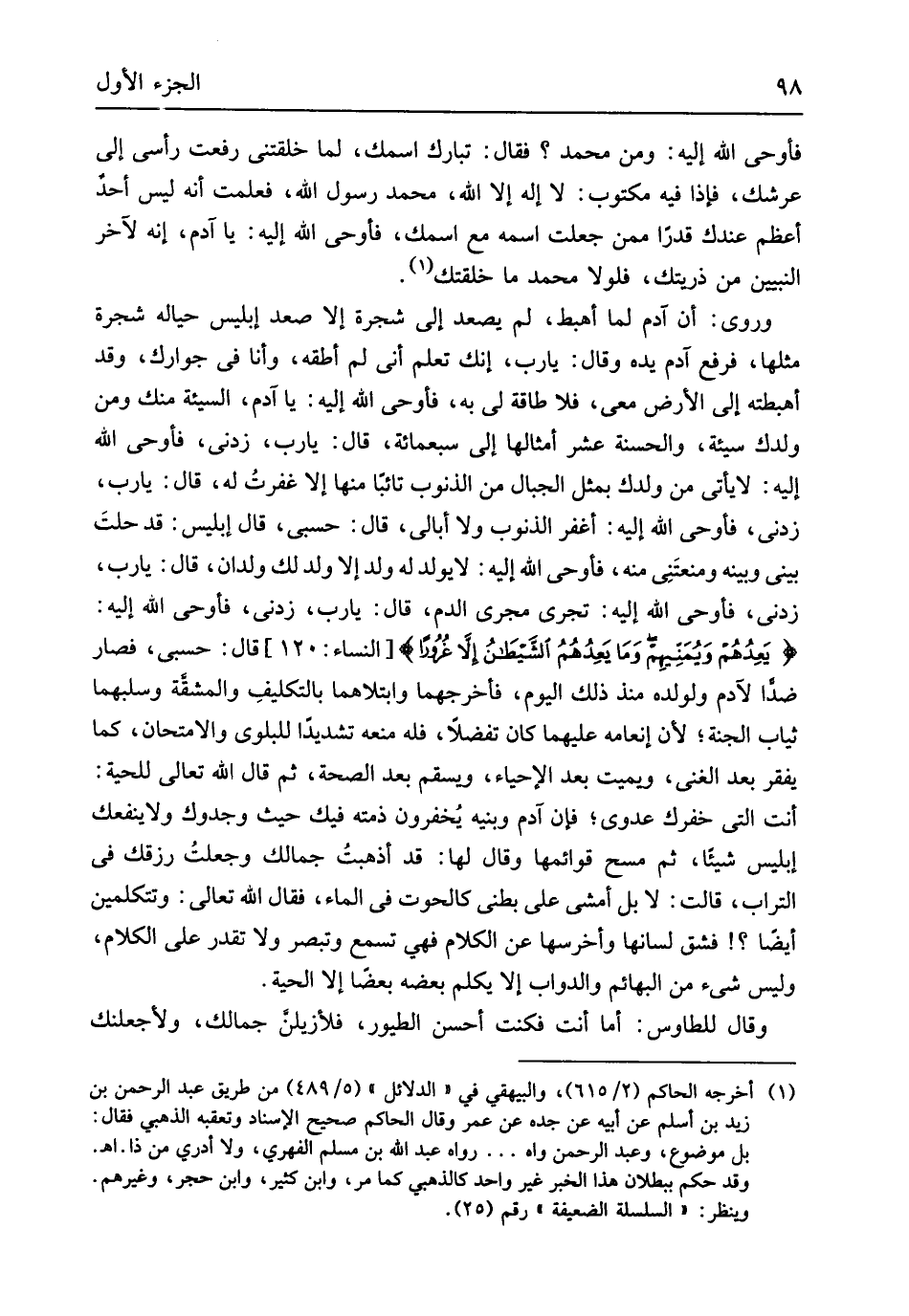 فَأوحى الله إِلَيْهِ وَمن مُحَمَّد فَقَالَ تبَارك اسْمك لما خلقتني رفعت رَأْسِي إِلَى عرشك فَإِذا فِيهِ مَكْتُوب لَا إِلَه إِلَّا الله مُحَمَّد رَسُول الله فَعلمت أَنه لَيْسَ أحد اعظم عِنْد قدرا مِمَّن جعلت اسْمه مَعَ اسْمك فَأوحى الله إِلَيْهِ يَا آدم إِنَّه لآخر النَّبِيين من ذريتك فلولا مُحَمَّد مَا خلقتك وروى أَن آدم لما أهبط لم يصعد إِلَى شَجَرَة إِلَّا صعد إِبْلِيس حياله شَجَرَة مثلهَا فَرفع آدم يَده وَقَالَ يَا رب إِنَّك تعلم أَنِّي لم أطقه وَأَنا فِي جوارك وَقد أهبطته إِلَى الأَرْض معي فَلَا طَاقَة لي بِهِ فَأوحى الله إِلَيْهِ يَا آدم السَّيئَة مِنْك وَمن ولدك سَيِّئَة والحسنة عشر أَمْثَالهَا إِلَى سَبْعمِائة قَالَ يَا رب زِدْنِي فَأوحى الله إِلَيْهِ لَا يَأْتِي من ولدك بِمثل الْجبَال من الذُّنُوب تَائِبًا مِنْهَا إِلَّا غفرت لَهُ قَالَ يَا رب زِدْنِي فَأوحى الله إِلَيْهِ أَغفر الذُّنُوب وَلَا أُبَالِي قَالَ حسبي قَالَ إِبْلِيس قد حلت بَين وَبَينه ومنعتني مِنْهُ فَأوحى الله إِلَيْهِ لَا يُولد لَهُ ولد إِلَّا ولد لَك ولدان قَالَ يَا رب زِدْنِي فَأوحى الله إِلَيْهِ تجْرِي مجْرى الدَّم قَالَ يَا رب زِدْنِي فَأوحى الله إِلَيْهِ {يَعِدُهُمْ وَيُمَنّيهِمْ وَمَا يَعِدُهُمُ الشَّيْطَان إِلاَّ غُرُوراً} النِّسَاء 120 قَالَ حسبي فَصَارَ ضداً لآدَم ولولده مُنْذُ ذَلِك الْيَوْم فأخرجهما وابتلاهما بالتكليف وَالْمَشَقَّة وسلبهما ثِيَاب الْجنَّة لِأَن إنعامه عَلَيْهِم كَانَ تفضلاً فَلهُ مَنعه تشديداً للبلوى والامتحان كَمَا يفقر بعد الْغنى وَيُمِيت بعد الْإِحْيَاء ويسقم بعد الصِّحَّة ثمَّ قَالَ الله تَعَالَى للحية أَنْت الَّتِي خفرك عدوي فَإِن آدم وبنيه يخفرون ذمَّته فِيك حَيْثُ وجدوك وَلَا ينفعك إِبْلِيس شَيْئا ثمَّ مسح قَوَائِمهَا وَقَالَ لَهَا قد أذهبت جمالك وَجعلت رزقك فِي التُّرَاب قَالَت لَا بل أَمْشِي على بَطْني كالحوت فِي المَاء فَقَالَ الله تَعَالَى وتتكلمين أَيْضا فشق لسانها وأخرسها عَن الْكَلَام فَهِيَ تسمع وتبصر وَلَا تقدر على الْكَلَام وَلَيْسَ شَيْء من الْبَهَائِم وَالدَّوَاب إِلَّا يكلم بعضه بَعْضًا إِلَّا الْحَيَّة وَقَالَ للطاوس أما أَنْت فَكنت احسن الطُّيُور فلأزيلن جمالكم ولأجعلنك