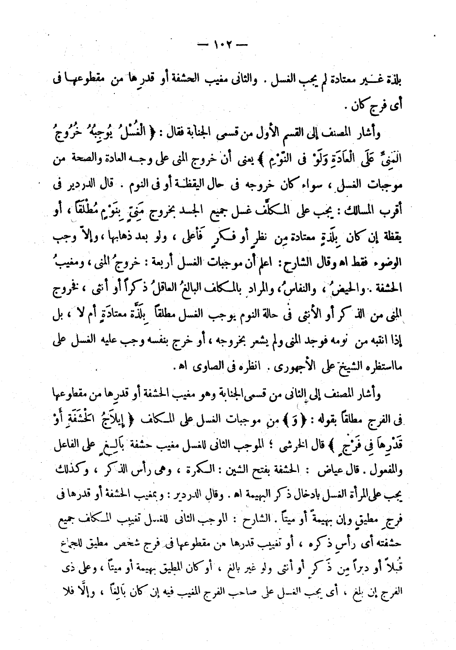 وأشار المصنف إلى القسم الأول من قسمي الجنابة فقال: " الغسل يوجبه خروج المني على العادة ولو في النوم " يعني أن خروج المني على وجه العادة والصحة من موجبات الغسل، سواء كان خروجه في حال اليقظة أو في النوم. قال الدردير في أقرب المسالك: يجب على الكلف غسل جميع الجسد بخروج مني بنوم مطلقا، أو يقظة إن كان بلذة معتادة من نظر أو فكر فأعلى، ولو بعدها ذهابها، وإلا وجب الوضوء فقط اهـ وقال الشارح: اعلم أن موجبات الغسل أربعة: خروج المني، ومغيب الحشفة، والحيض، والنفاس، والمراد بالمكلف البالغ العاقل ذكرا أو أنثى، فخروج المني من الذكر أو الأنثى في حالة النوم يوجب الغسل مطلقا بلذة معتادة أم لا، بل إذا انتبه من نومه فوجد المني ولم يشعر بخروجه، أو خرج بنفسه وجب عليه الغسل على ما استظهره الشيخ على الأجهوري. انظره في الصاوي اهـ.
