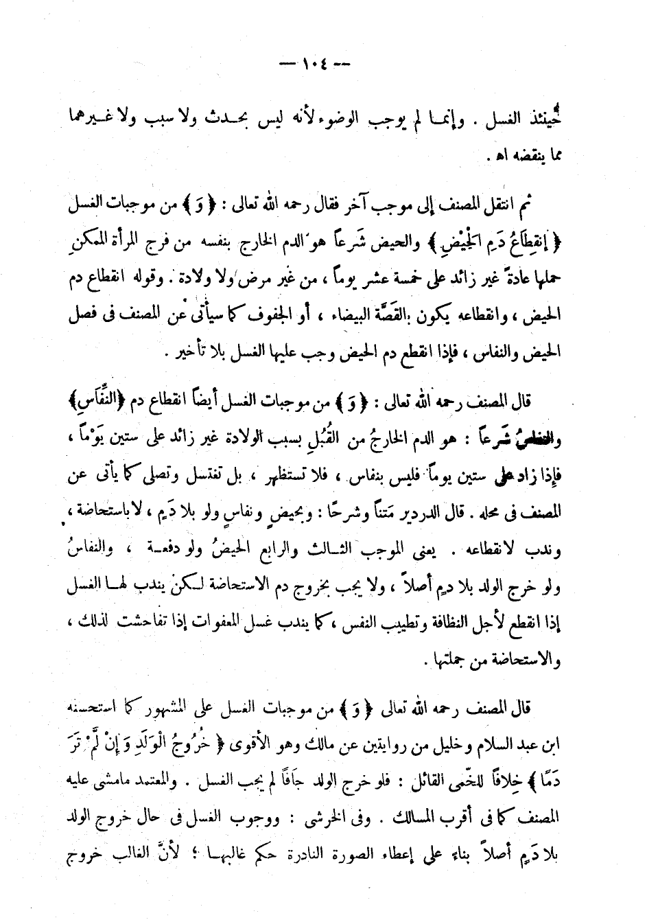 ثم انتقل المصنف إلى موجب آخر فقال رحمه الله تعالى: " و " من موجبات الغسل " انقطاع دم الحيض " والحيض شرعا هو الدم الخارج بنفسه من فرج المرأة الممكن حملها عادة غير زائد على خمسة عشر يوما، من غير مرض ولا ولادة. وقوله انقطاع دم الحيض، وانقطاعه يكون بالقصة البيضاء، أو الجفوف كما سيأتي