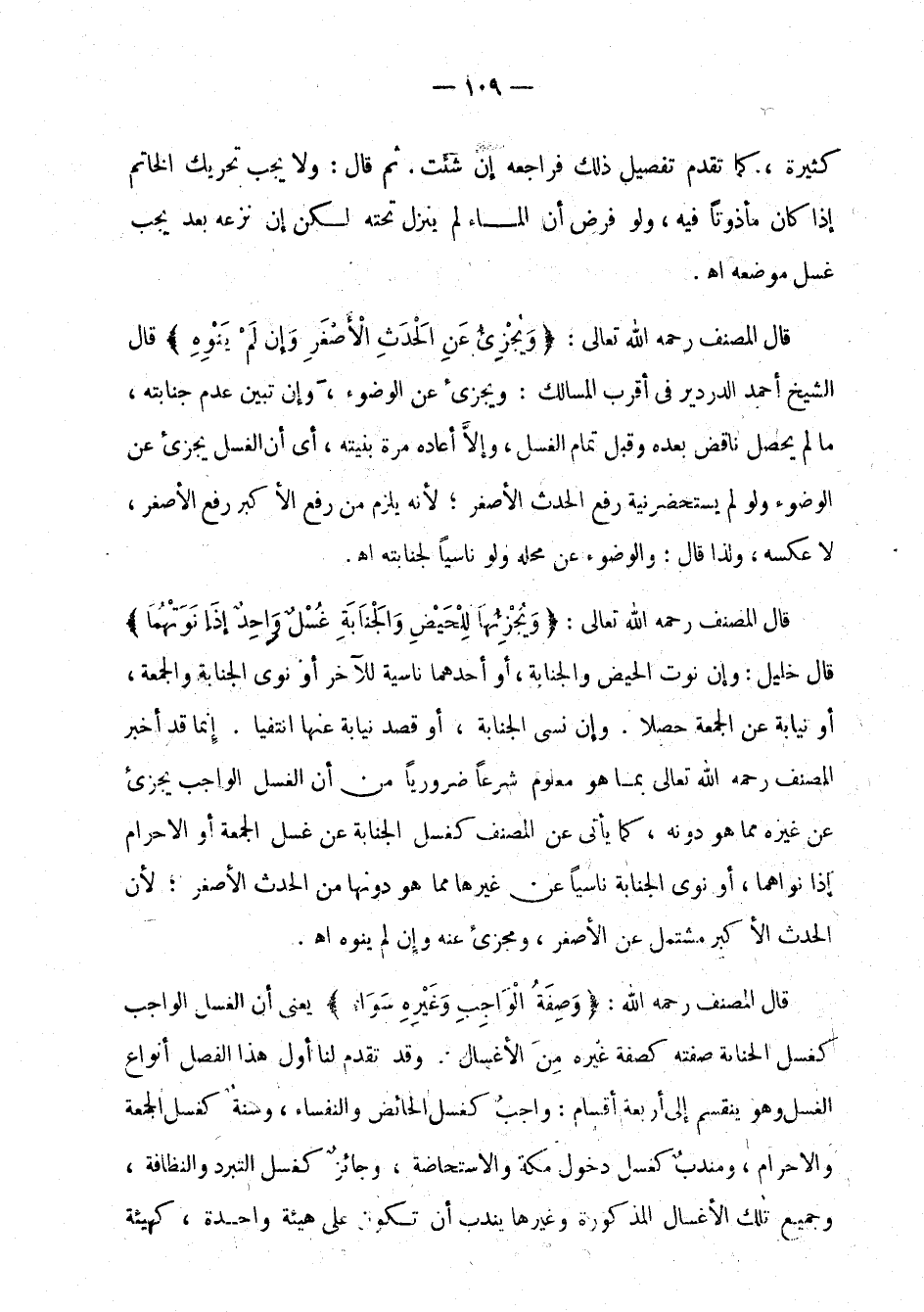 قال المصنف رحمه الله تعالى: " ويجزئ عن الحدث الأصغر وإن لم ينوه " قال الشيخ أحمد الدردير في أقرب المسالك: ويجزئ عن الوضوء، وإن تبين عدم جنابته، ما لم يحصل ناقض بعده وقبل تمام الغسل، وإلا أعاده مرة بنيته، أي إن الغسل يجزئ عن الوضوء ولو لم يستحضر نية رفع الحدث الأصغر؛ لأنه يلزم من رفع الأكبر رفع الأصغر، لا عكسه، ولذا قال: والوضوء عن محله ولو ناسيا لجنابته اهـ.