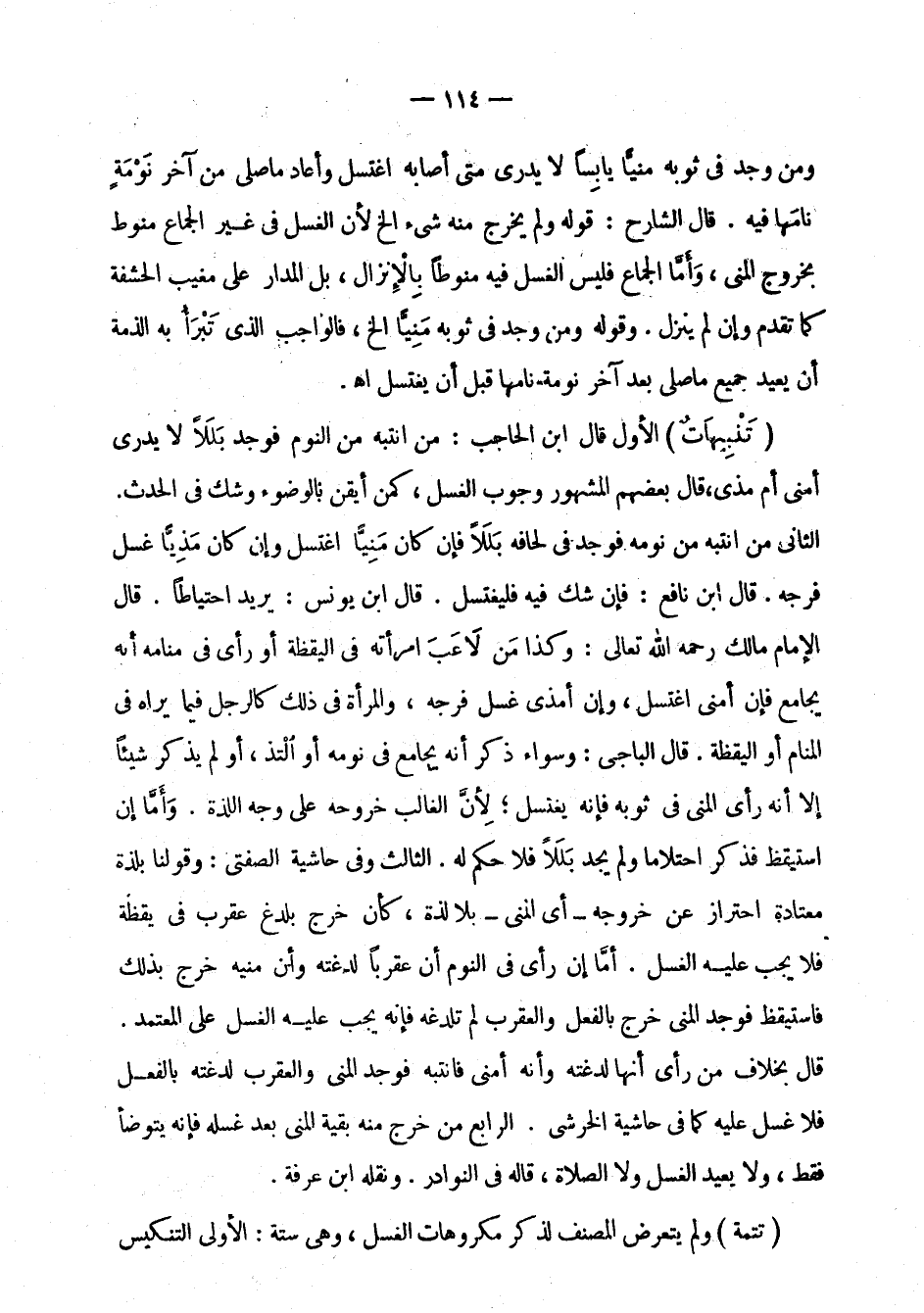 الأول قال ابن الحاجب: من انتبه من النوم فوجد بللا لا يدري أمني أم مذي، قال بعضهم المشهور وجوب الغسل، كمن أيقن بالوضوء وشك في الحدث. الثاني من انتبه من نومه فوجد في لحافه بللا فإن كان منيا اغتسل إن كان مذيا غسل فرجه. قال ابن نافع: فإن شك فيه فليغتسل. قال ابن يونس: يريد احتياطا. قال الإمام رحمه الله تعالى: وكذا من لاعب امرأته في اليقظة أو رأى في منامه أنه يجامع فإن أمنى اغتسل، وإن أمذى غسل فرجه، والمرأة في ذلك كالرجل فيما يراه في المنام أو اليقظة. قال الباجي: وسواء ذكر أنه يجامع في نومه أو التذ، أو لم يذكر شيئا إلا أنه رأى المني في ثوبه فإنه يغتسل؛ لأن الغالب خروجه على وجه اللذة. وأما إن استيقظ فذكر احتلاما ولم يجد بللا فلا حكم له.