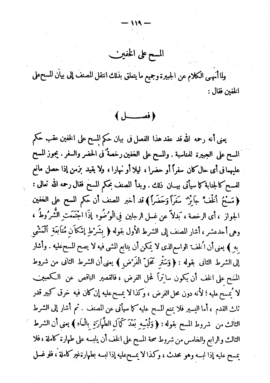 يعني أنه رحمه الله قد عقد هذا الفصل في بيان حكم المسح على الخفين عقب حكم المسح على الجبيرة للمناسبة. والمسح على الخفين رخصة في الحضر والسفر. يجوز المسح في أي حال كان سفرا أو حضرا، ليلا أو نهارا، ولا يقيد بزمن إذا حصل مانع للمسح كالجنابة كما سيأتي بيان ذلك. وبدأ المصنف بحكم المسح فقال رحمه الله تعالى: " مسح الخف جائز سفرا أو حضرا " قد أخبر المصنف أن حكم المسح على الخفين الجواز، أي الرخصة، بدلا عن غسل الرجلين في الوضوء إذا اجتمعت الشروط، وهي أحد عشر أشار المصنف إلى الشرط الأول بقوله: " بشر ط إمكان متابعة المشي به " يعني أن الخف الواسع الذي لا يمكن أن يتابع المشي فيه لا يصح المسح عليه. وأشار إلى الشرط الثاني بقوله: " وستر محل الفرض " يعني أن الشرط الثاني من شروط المسح على الخف أن يكون ساترا لمحل الفرض، فالقصير