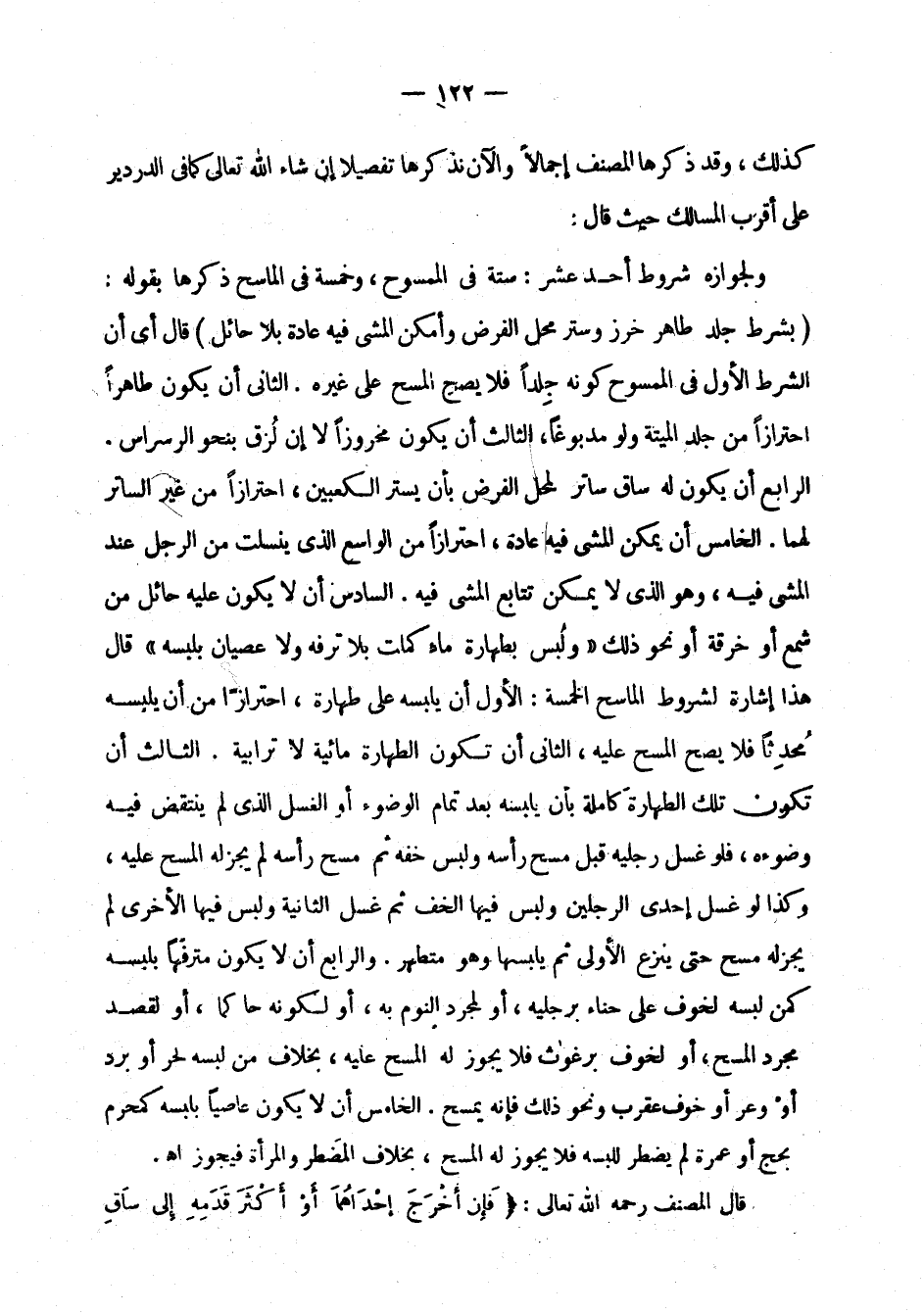 ولجوازه شروط أحد عشر: ستة في الممسوح، وخمسة في الماسح ذكرها بقوله: " بشرط جلد طاهر خرز وستر محل الفرض وأمكن المشي فيه عادة بلا حائل " قال أي أن الشرط الأول في الممسوح كونه جلدا فلا يصح المسح على غيره. الثاني أن يكون طاهرا احترازا من جلد الميتة ولو مدبوغا، الثالث أن يكون مخروزا لا إن لزق بنحو الرسراس. الرابع أن يكون له ساق ساتر لمحل الفرض بأن يستر الكعبين، احترازا من غير الساتر لهما. الخامس أن يمكن المشي فيه عادة، احترازا من الواسع الذي ينسلت من الرجل عند المشي فيه، وهو الذي لا يمكن تتابع المشي فيه. السادس أن لا يكون عليه حائل من شمع أو خرقة أو نحو ذلك " ولبس بطهارة ماء كملت بلا ترفه ولا عصيان بلبسه " قال هذا إشارة لشروط الماسح الخمسة: الأول أن يلبسه على طهارة، احترازا من أن يلبسه محدثا فلا