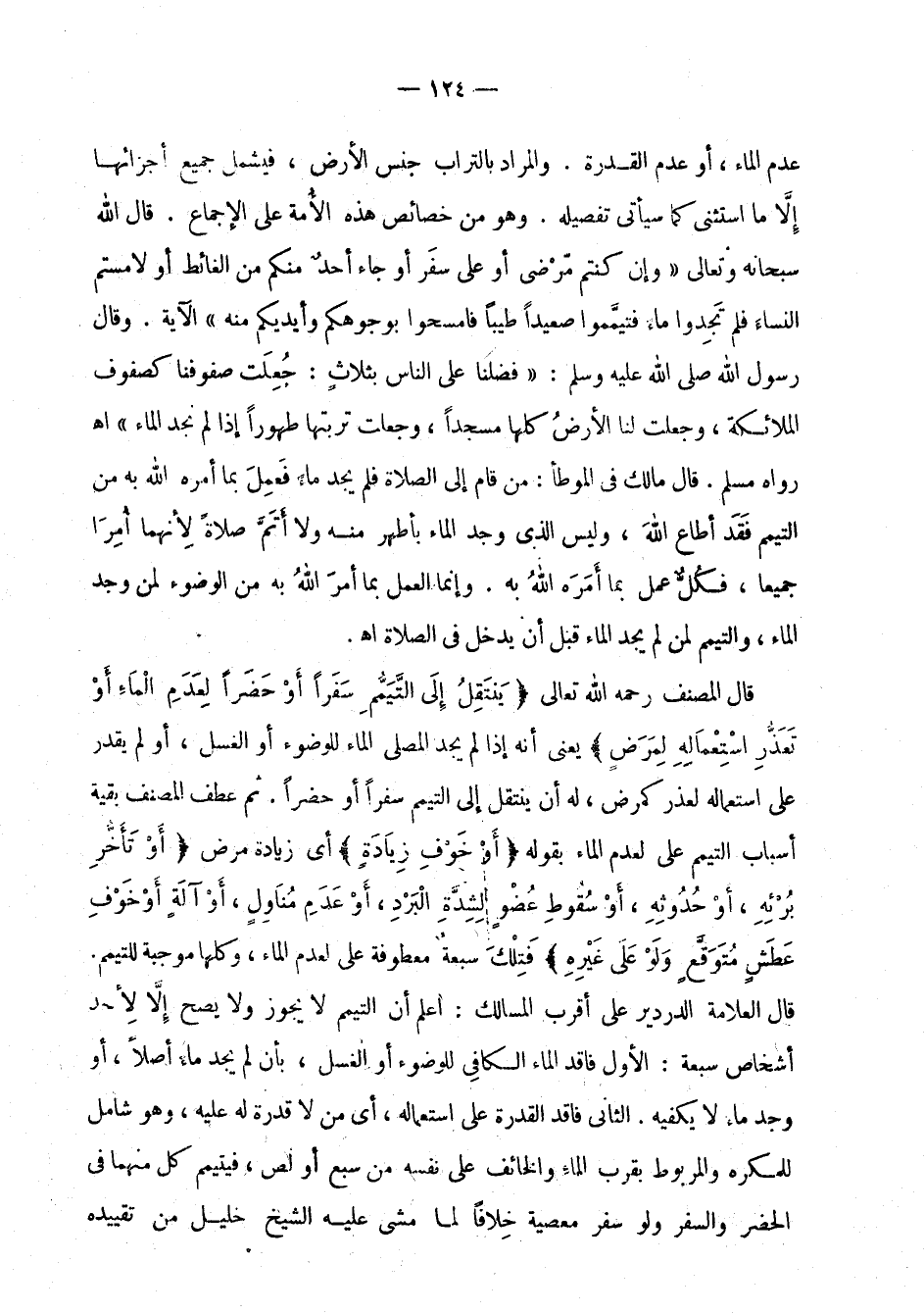 قال المصنف رحمه الله تعالى: " ينتقل إلى التيمم سفرا أو حضرا لعدم الماء أو تعذر استعماله لمرض " يعني أنه إذا لم يجد المصلي الماء للوضوء أو الغسل، أو لم يقدر على استعماله لعذر كمرض، له أن ينتقل إلى التيمم سفرا أو حضرا. ثم عطف المصنف بقية أسباب التيمم على لعدم الماء بقوله: " أو خوف زيادة " أي زيادة مرض " أو تأخر برئه، أو حدوثه، أو سقوط عضو لشدة البرد، أو عدم مناول، أو آلة أو خوف خوف عطش متوقع ولو على غيره " فتلك سبعة معطوفة على لعدم الماء، وكلها موجبة للتيمم. قال العلامة الدردير على أقرب المسالك: اعلم أن التيمم لا يجوز ولا يصلح إلا لأحد أشخاص سبعة: الأول فاقد الماء الكافي للوضوء أو الغسل، بأن لم يجد ماء أصلا، أو وجد ماء لا يكفيه. الثاني فاقد القدرة على استعماله، أي من لا قدرة له عليه، وهو شامل للمكره والمربوط بقرب الماء والخائف على نفسه من سبع أو لص، فيتيمم كل كل منهما في الحضر والسفر ولو سفر معصية خلافا لما مشى عليه الشيخ خليل من تقييده