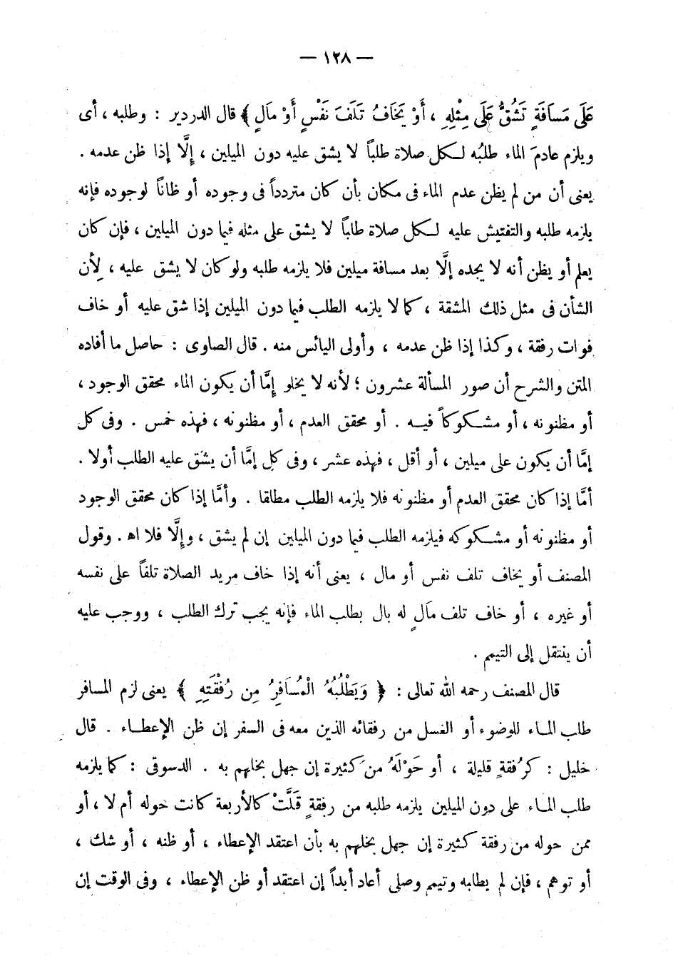 قال الصاوي: حاصل ما أفاده المتن والشرح أن صور المسألة عشرون؛ لأنه لا يخلو إما أن يكون الماء محقق الوجود، أو مظنونه، أو مشكوكا فيه. أو محقق العدم، أو مظنونه، فهذه خمس. وفي كل إما أن يكون على ميلين، أو أقل، فهذه عشر، وفي كل إما أن يشق عليه الطلب أو لا. أما إذا كان محقق العدم أو مظنونه فلا يلزمه الطلب مطلقا. وأما إذا كان محقق أو مظنونه أو مشكوكه فيلزمه الطلب فيما دون الميلين إن لم يشق، وإلا فلا اهـ. وقول المصنف أو يخاف تلف مال له بال بطلب الماء فإنه يجب ترك الطلب، ووجب عليه أن ينتقل إلى التيمم.